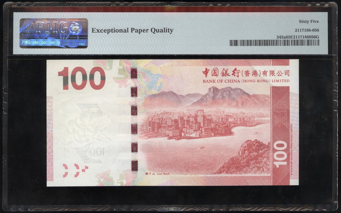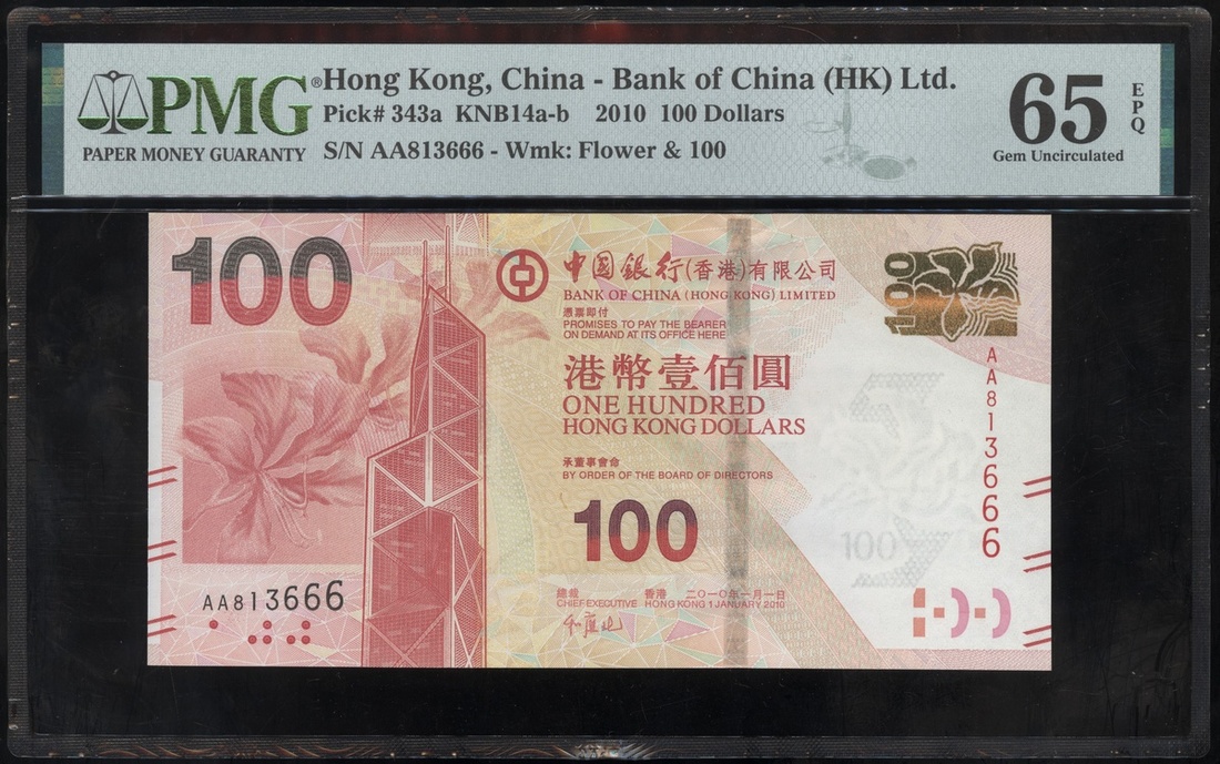 2010年中國銀行(香港)壹佰圓,編號AA813666,PMG65EPQ
