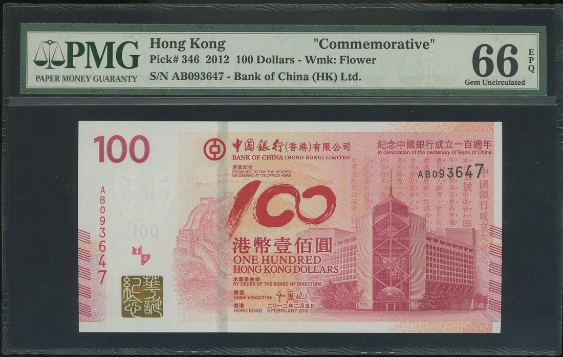 Bank of China, $100, 5.2.2012, serial number AB093647, centenary of Bank of China commemorative issue,