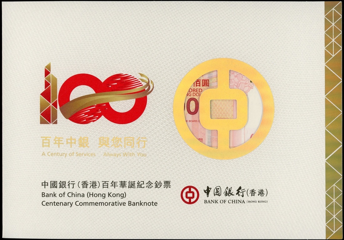 2017年中國銀行在港服務壹佰週年紀念鈔壹佰圓兩組,其中一組為三連鈔,編號BC685278, HK337216, HK347216 及 HK357216,均UNC品相,連原包裝
