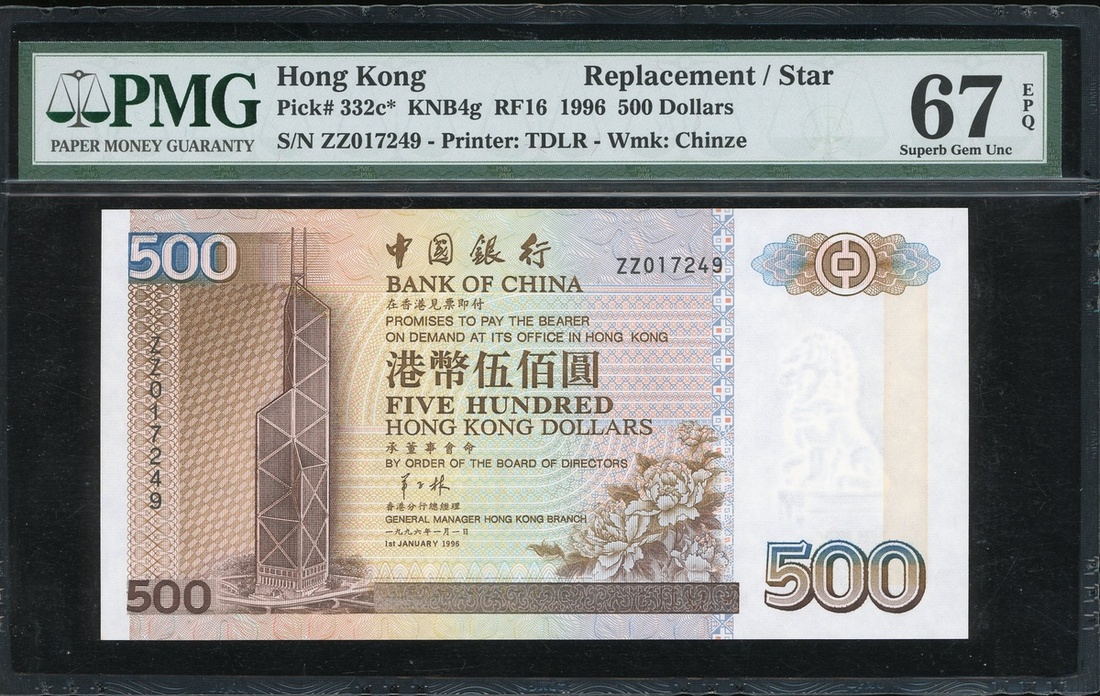 Bank of China, $500, 1.1.1996, replacement serial number ZZ017249, (Pick 332c*), PMG 67EPQ Superb Gem Uncirculated