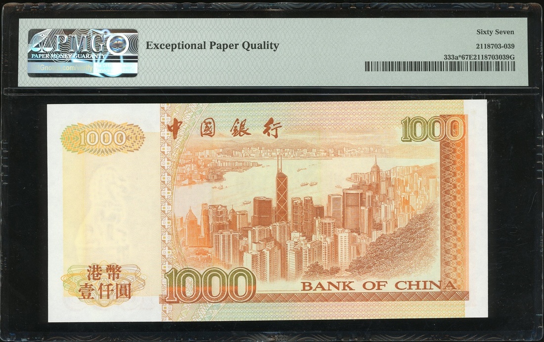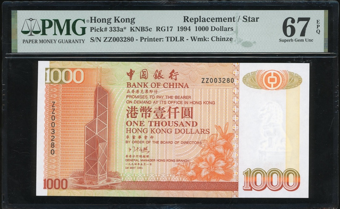 Bank of China, $1000, 1.5.1994, replacement serial number ZZ003280, (Pick 333a*), PMG 67EPQ Superb Gem Uncirculated, the highest grade in PMG population report!