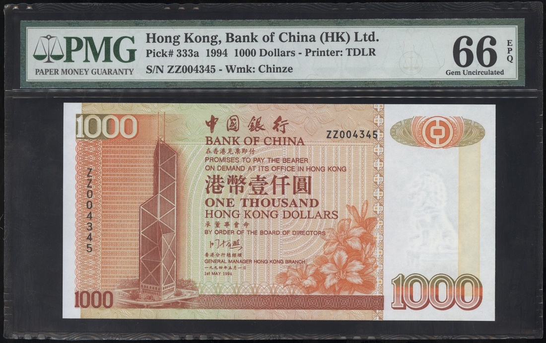 1994年中國銀行(香港)壹仟圓,補號ZZ004345,PMG66EPQ