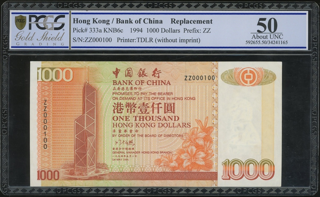Bank of China, $1000, 1.5.1994, low replacement serial number ZZ000100, (Pick 333a*), PCGS 50 About Uncirculated, A superb low serial number replacement