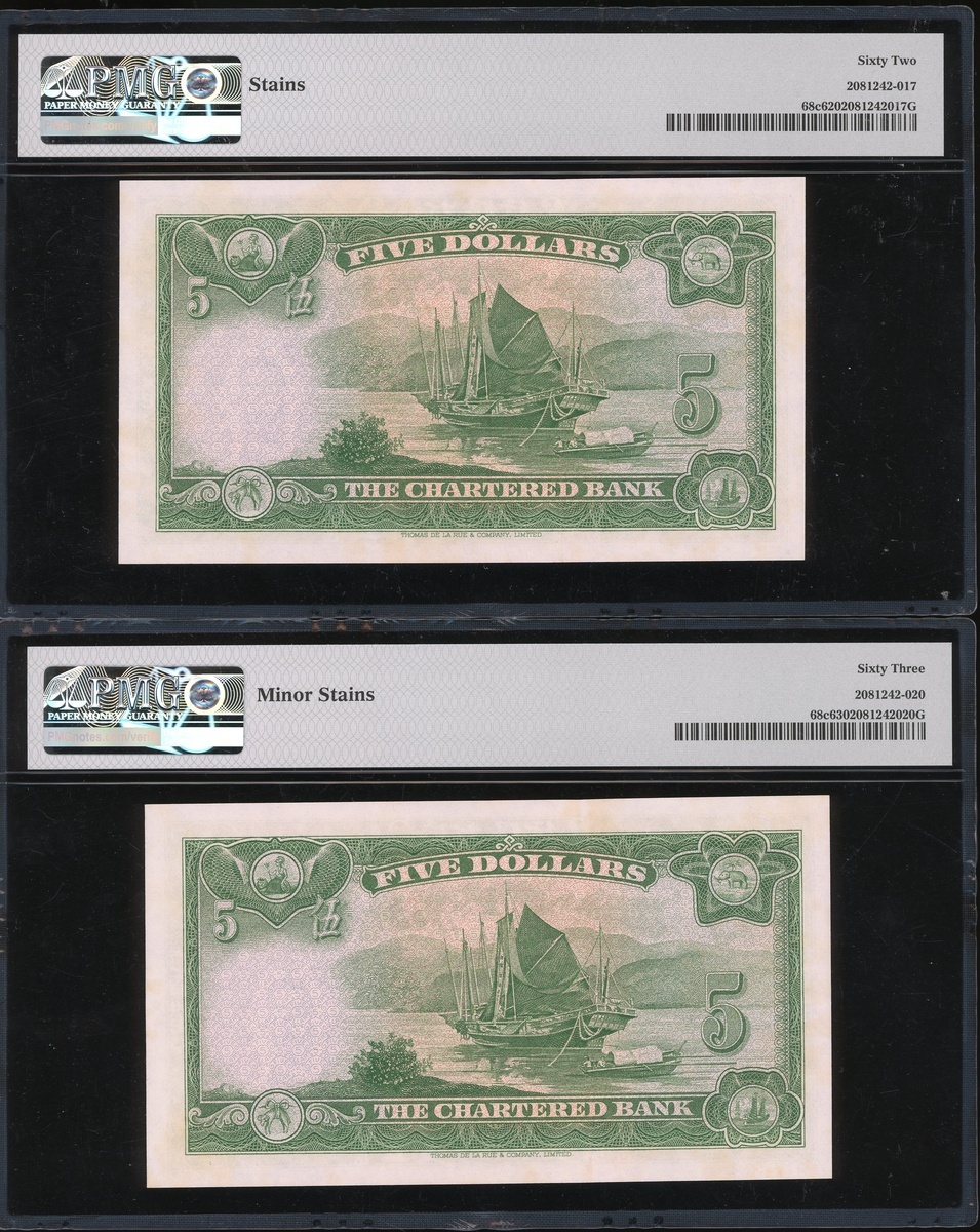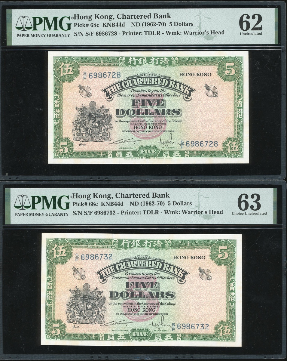 1962-70年渣打銀行一組兩枚5元,無日期,編號S/F 6986728及732,分別評PMG 62 ,有漬及63,輕微有漬