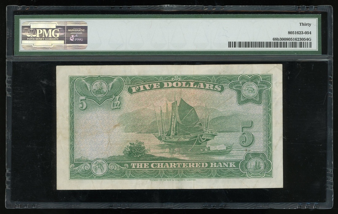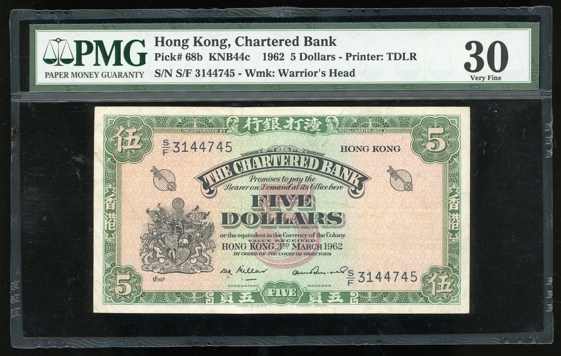 The Chartered Bank, $5, 3.3.1962, serial number S/F 3144745, (Pick 68b), PMG 30 Very Fine and a scarce date.