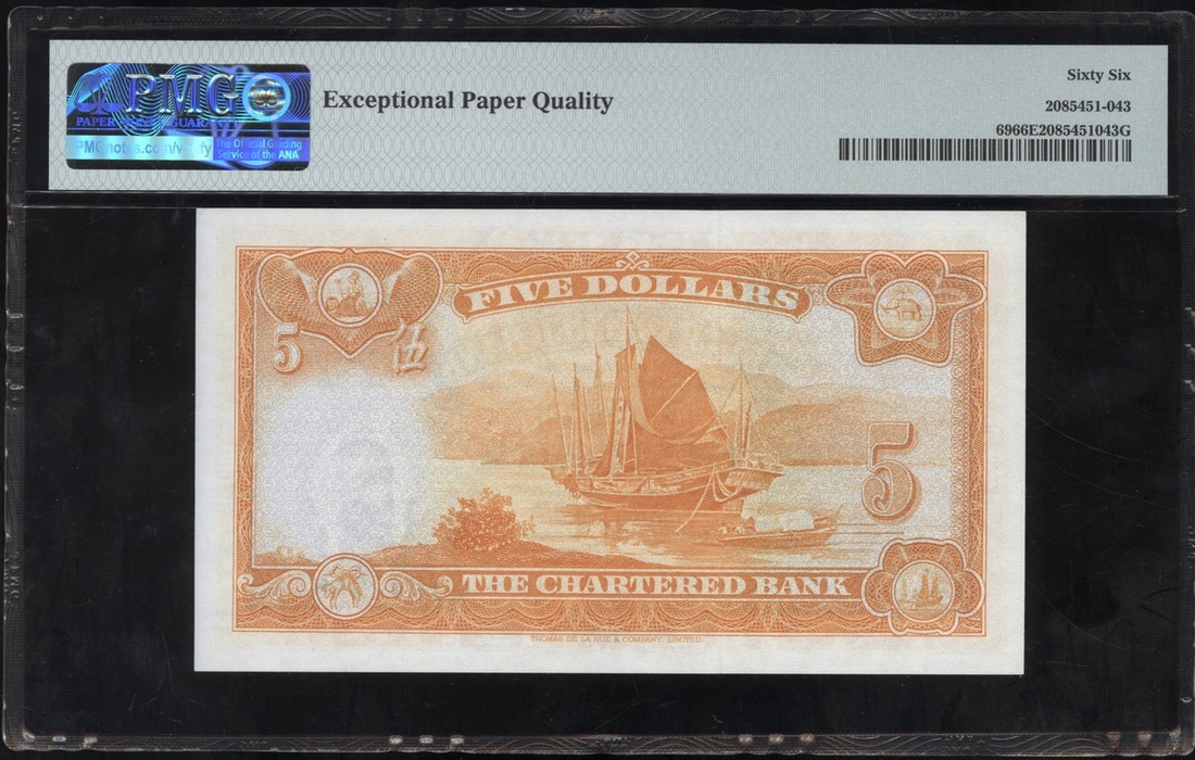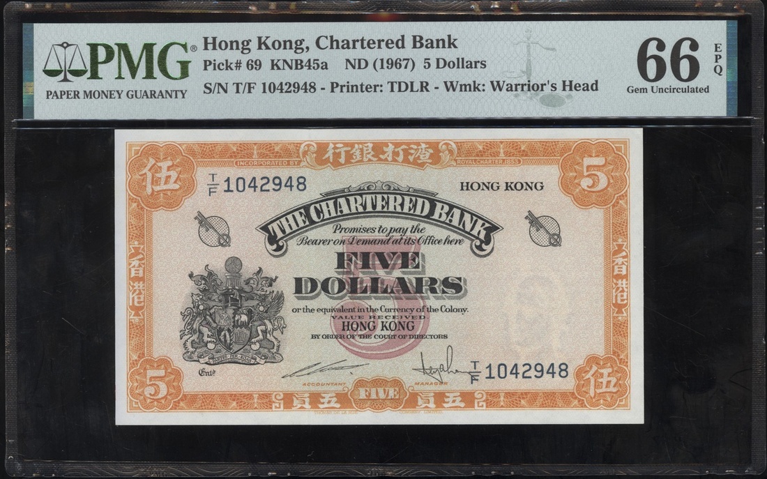 The Charterd Bank, $5, no date (1967), serial number T/F 1042948, (Pick 69), PMG 66EPQ Gem Uncirculated