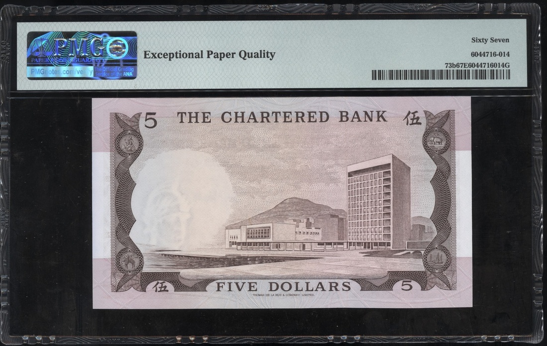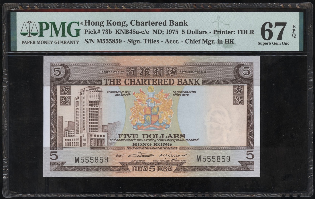 The Chartered Bank, 5 Dollars, ND(1970-75), serial number M555859, brown and multicoloured, bank building at left, (Pick 73b), PMG 67EPQ Superb Gem Uncirculated