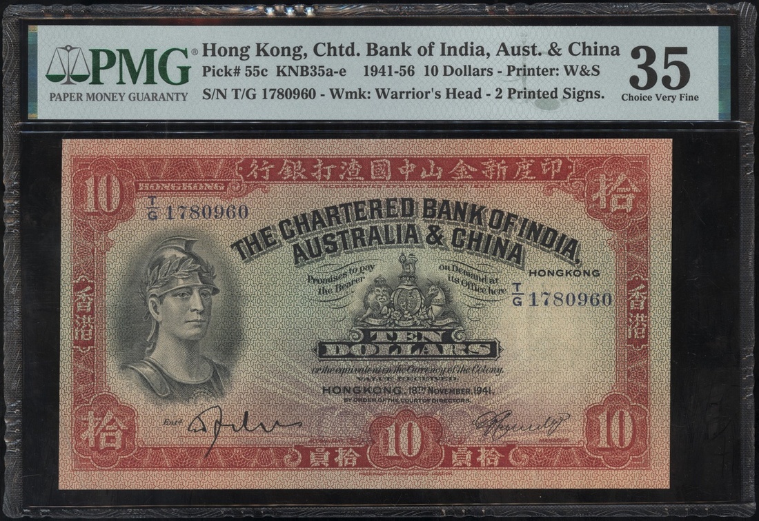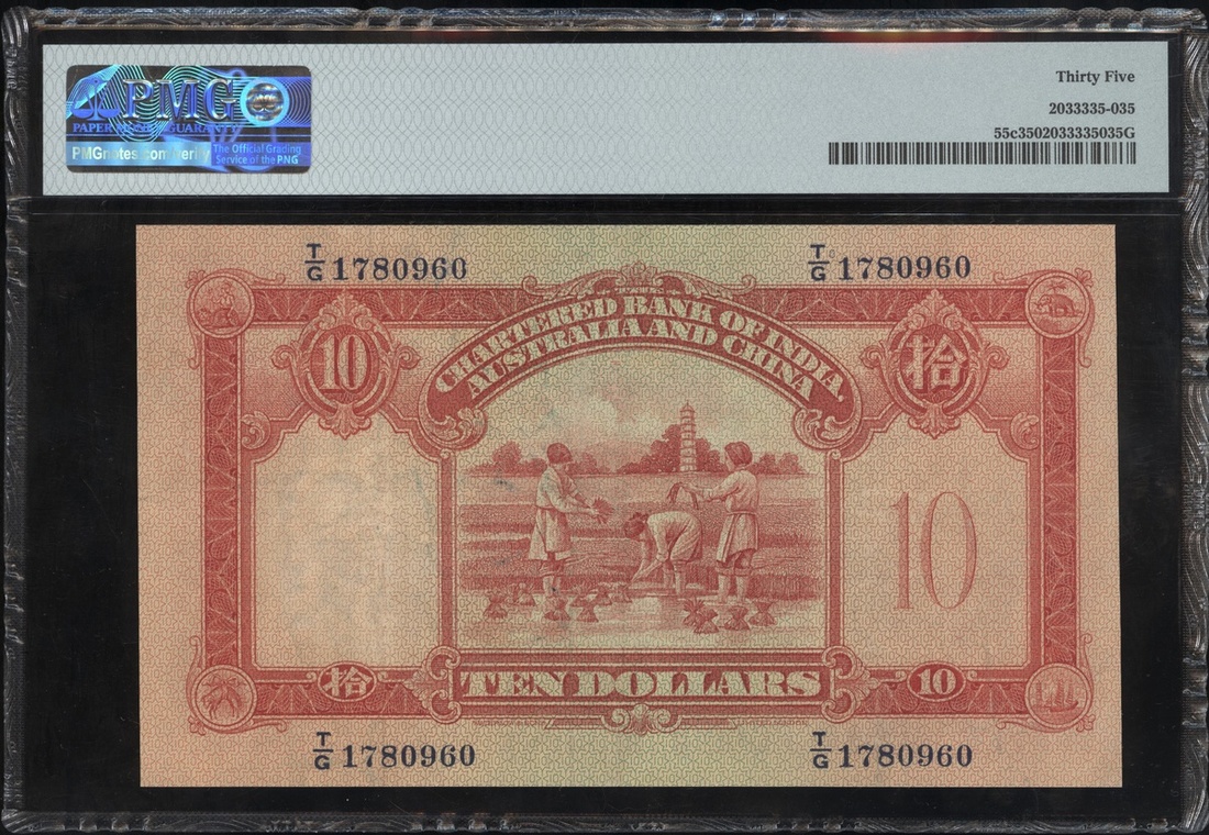 1941年印度新金山中國渣打銀行10元,編號T/G 1780960,PMG35