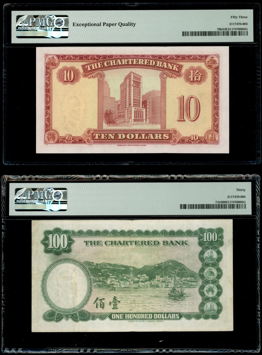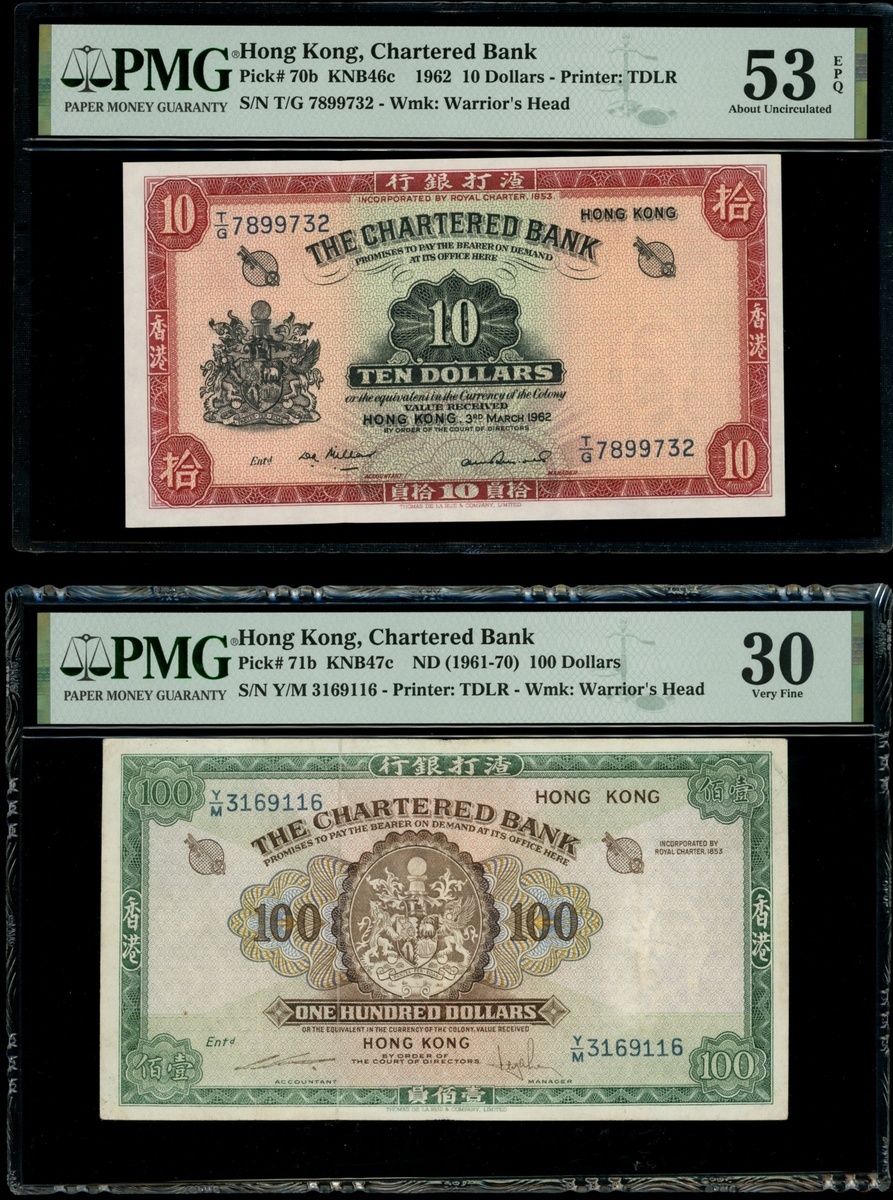 The Chartered Bank, a lot of $10 and $100, 3.3.1962 and ND(1961-70), serial number T/G7899732, Y/M3169116, (Pick 70b, 71b), PMG 53EPQ and 30 respectively. The $10 a scarce date (2)