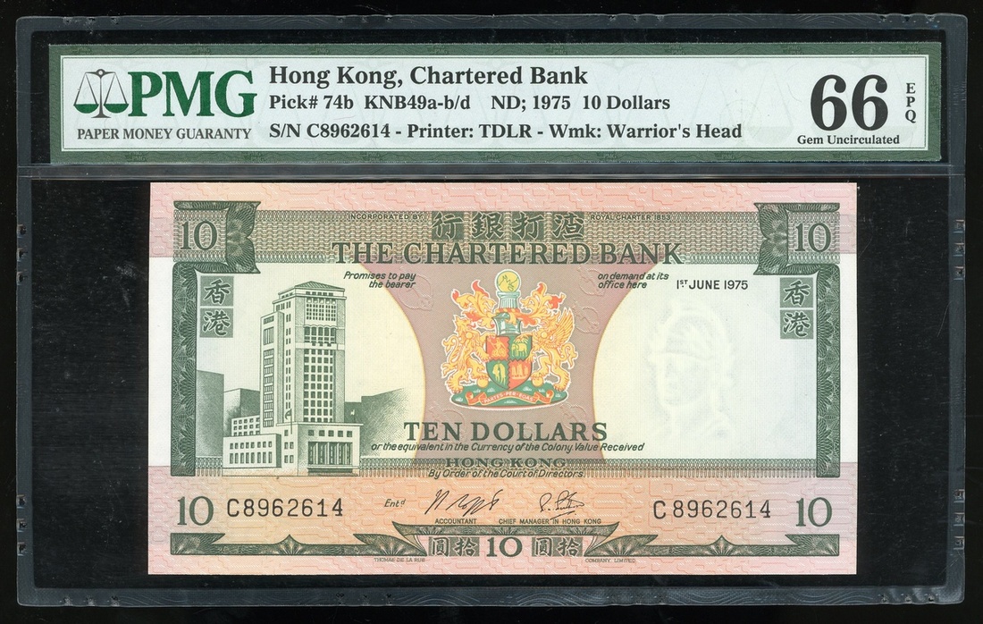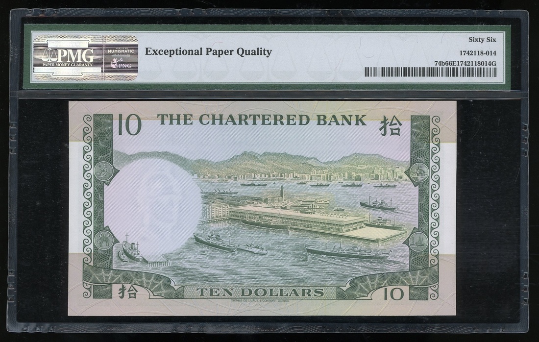 The Chartered Bank, $10, 1.6.1975, serial number C8962614, (Pick 74b), PMG 66EPQ Gem Uncirculated