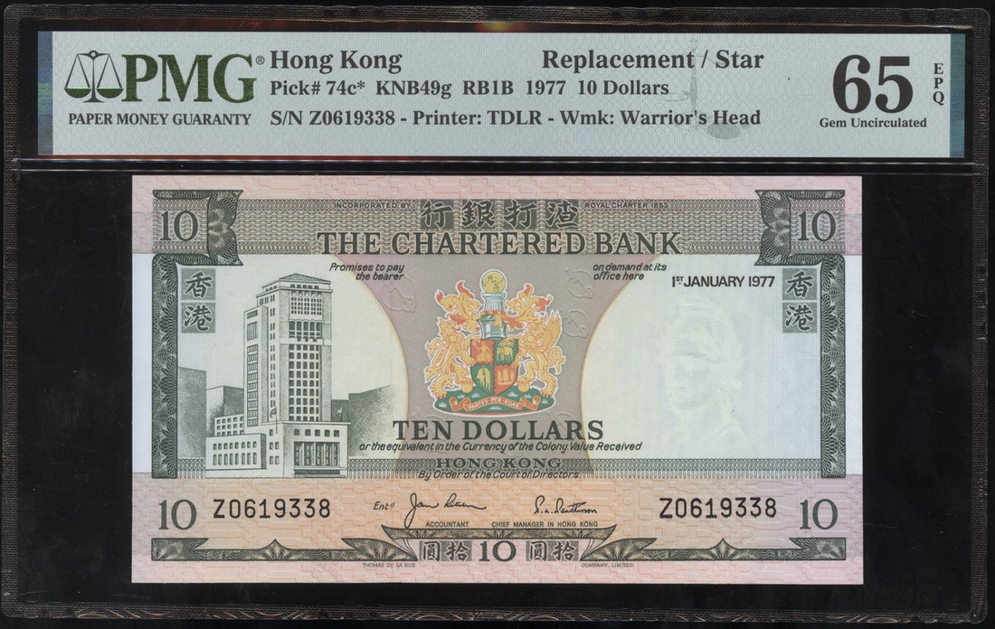 1977年渣打銀行10元,編號Z0619338,Z版補票,PMG65EPQ