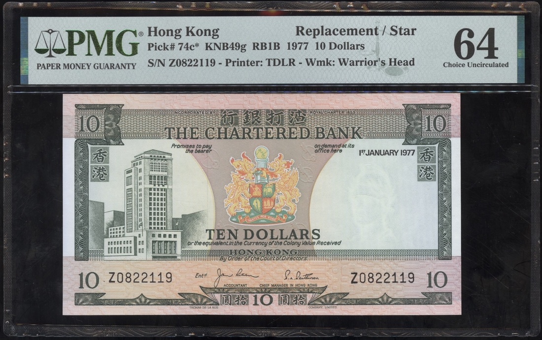 The Charterd Bank, $10, 1.1.1977, replacement serial number Z0822119, (Pick 74c*), PMG 64 Choice Uncirculated