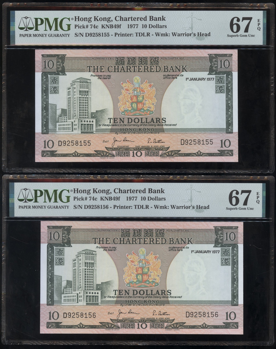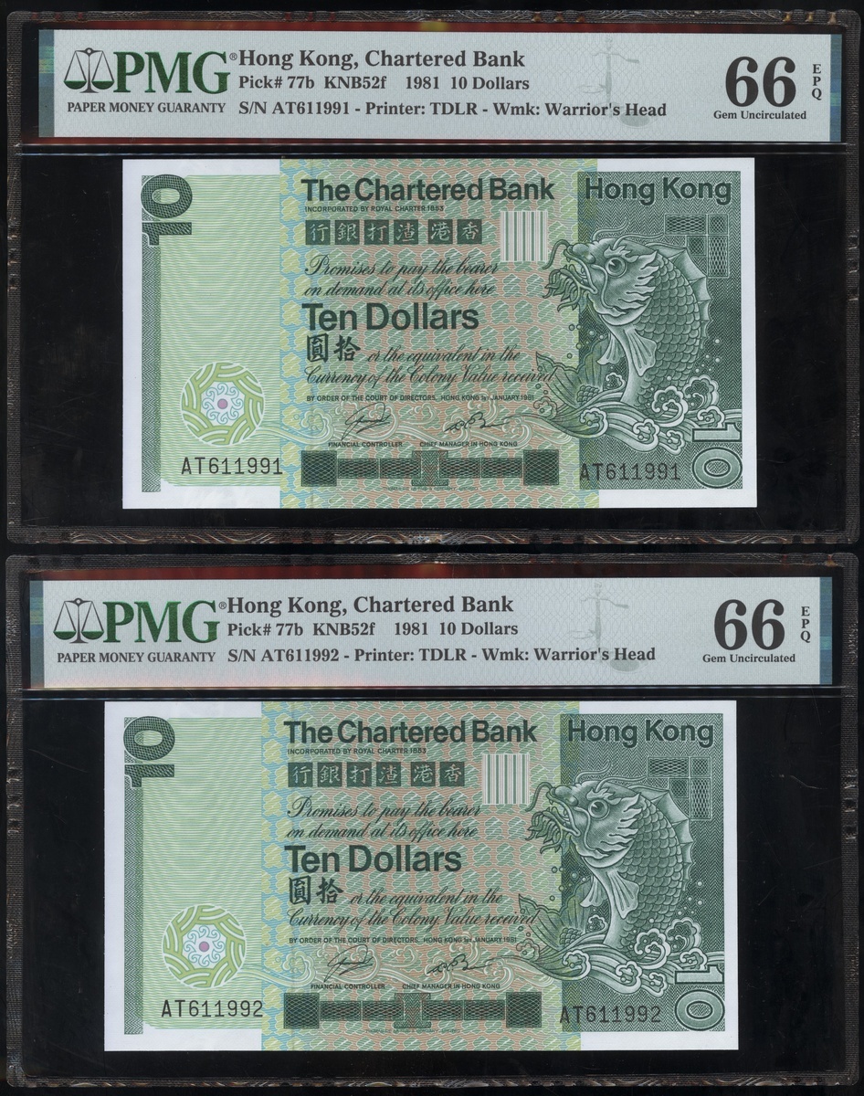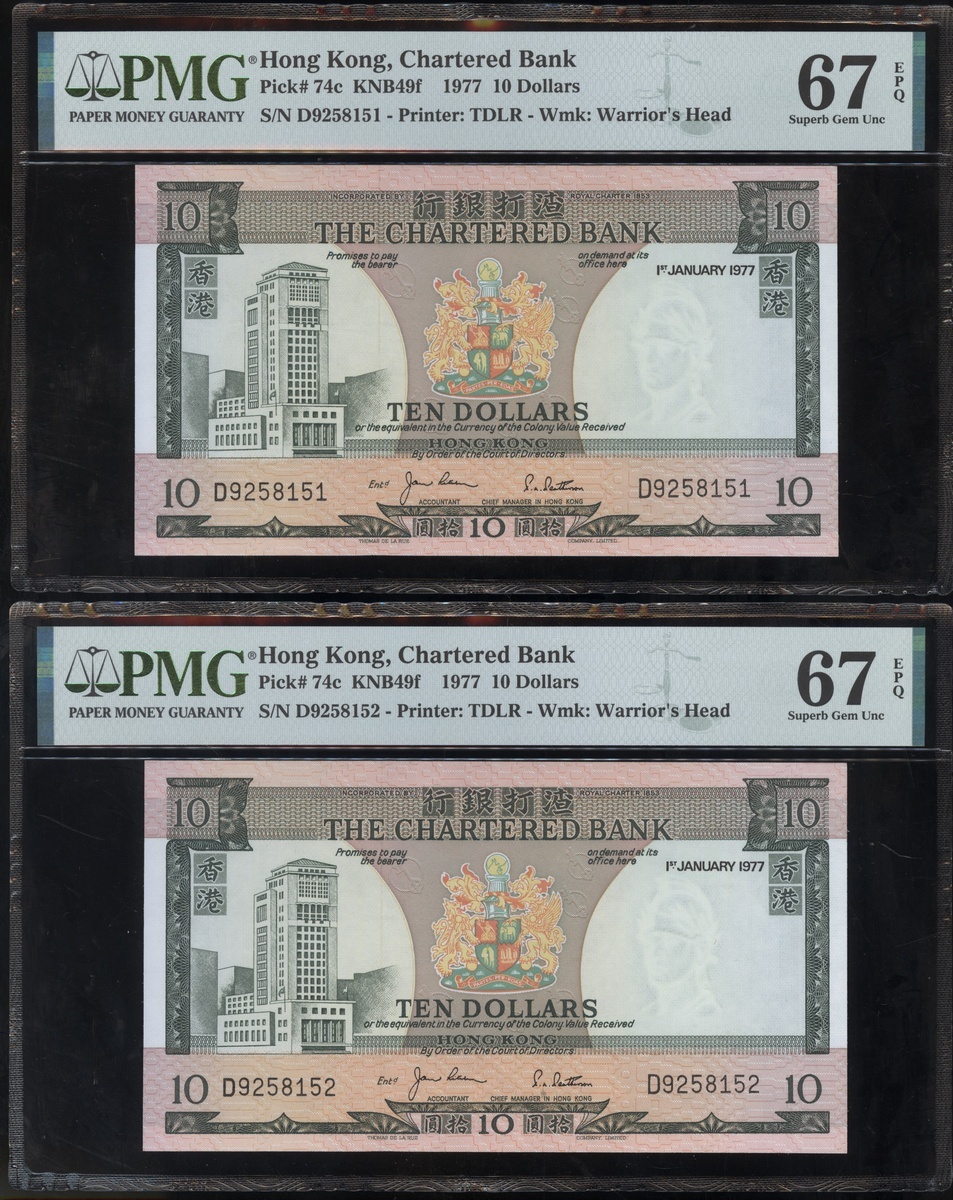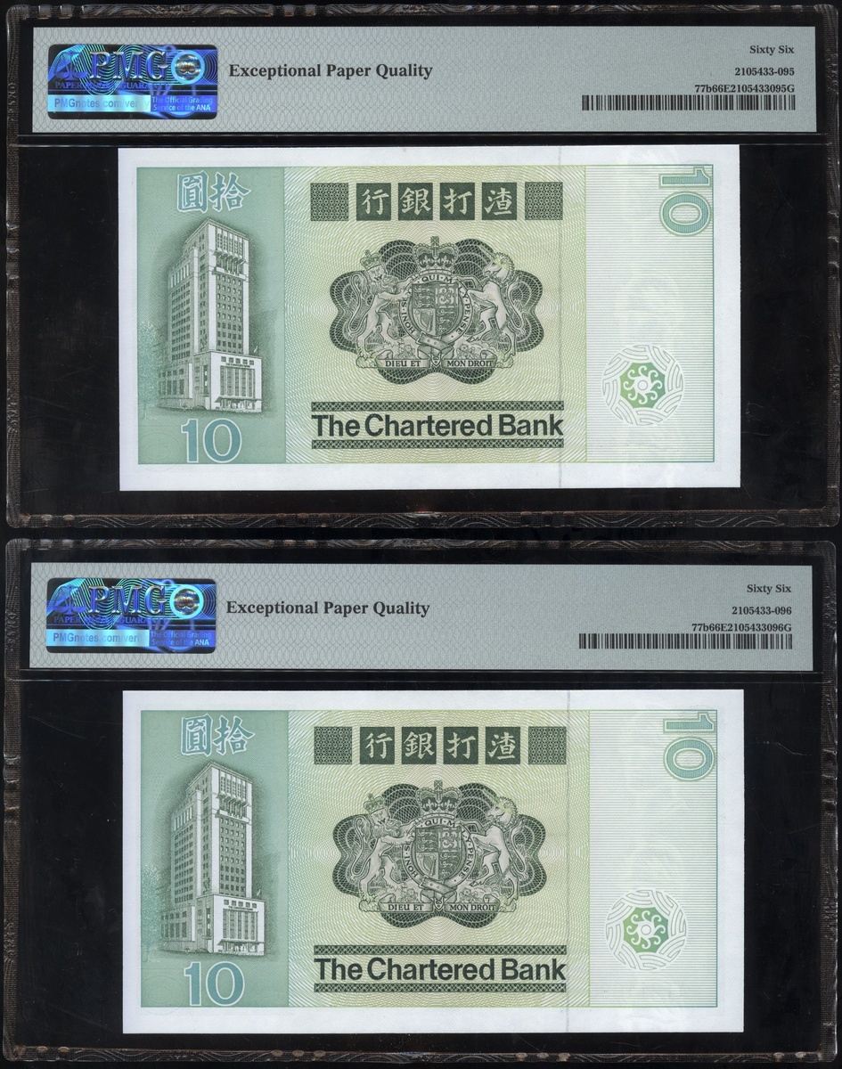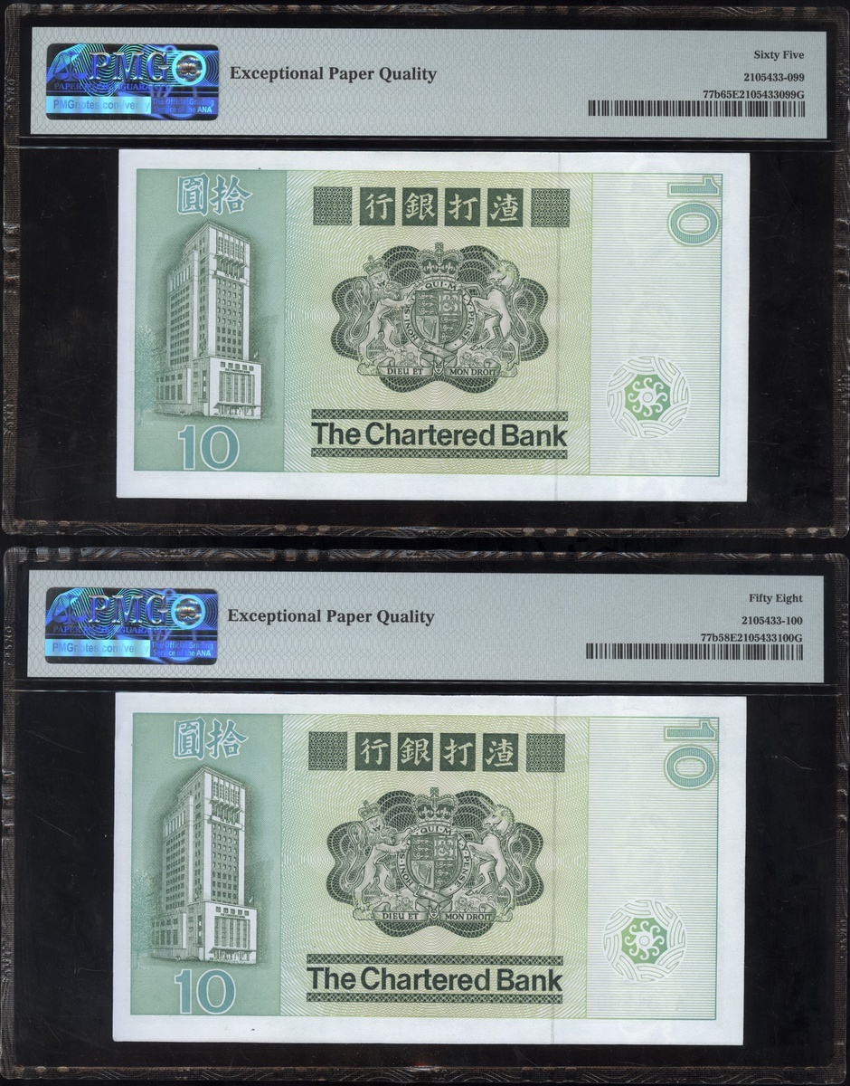 1977及1981年渣打銀行10元連號十枚共兩組,編號D9258151-D9258160 及AT611991-1200,PMG 58EPQ-67EPQ(20)