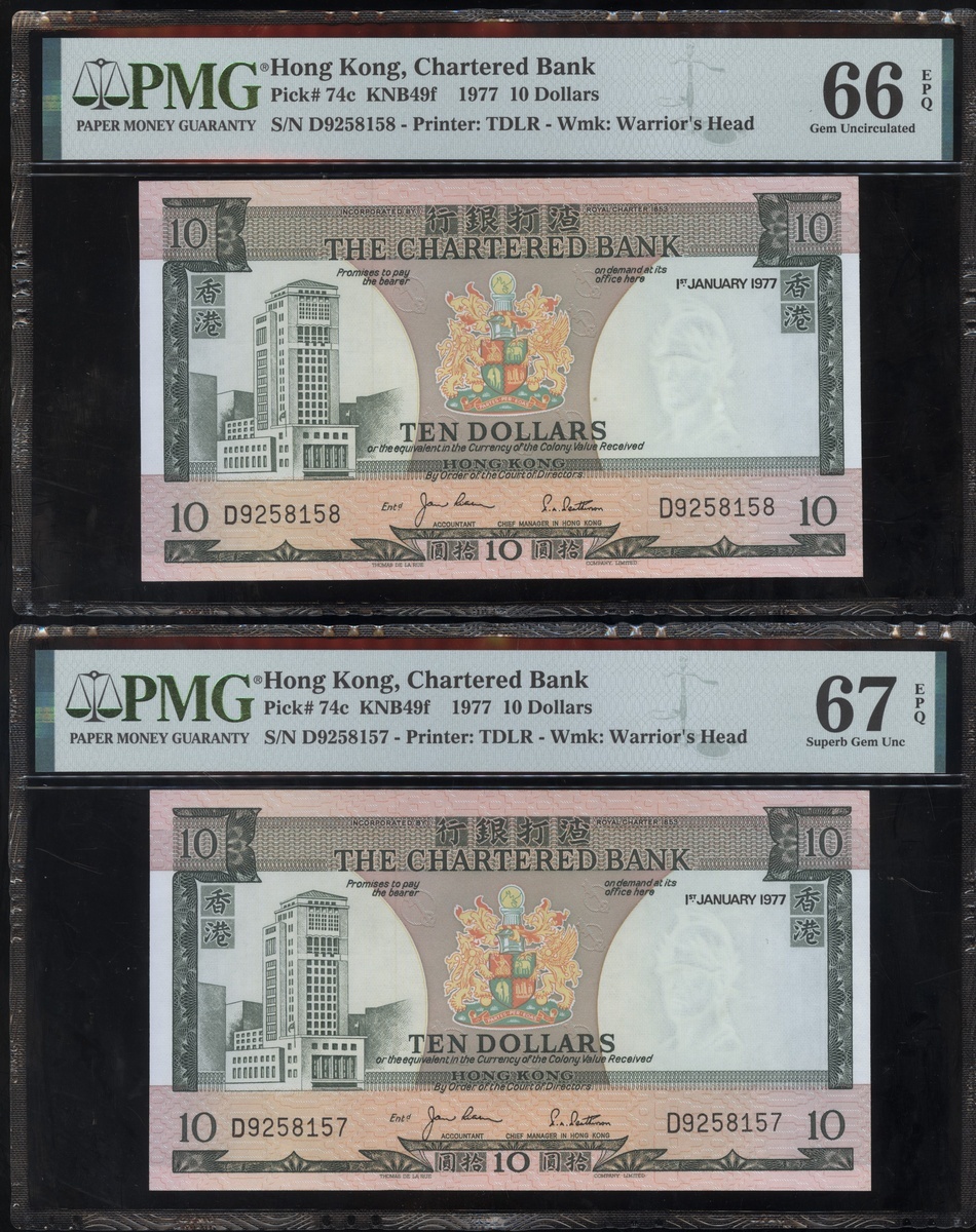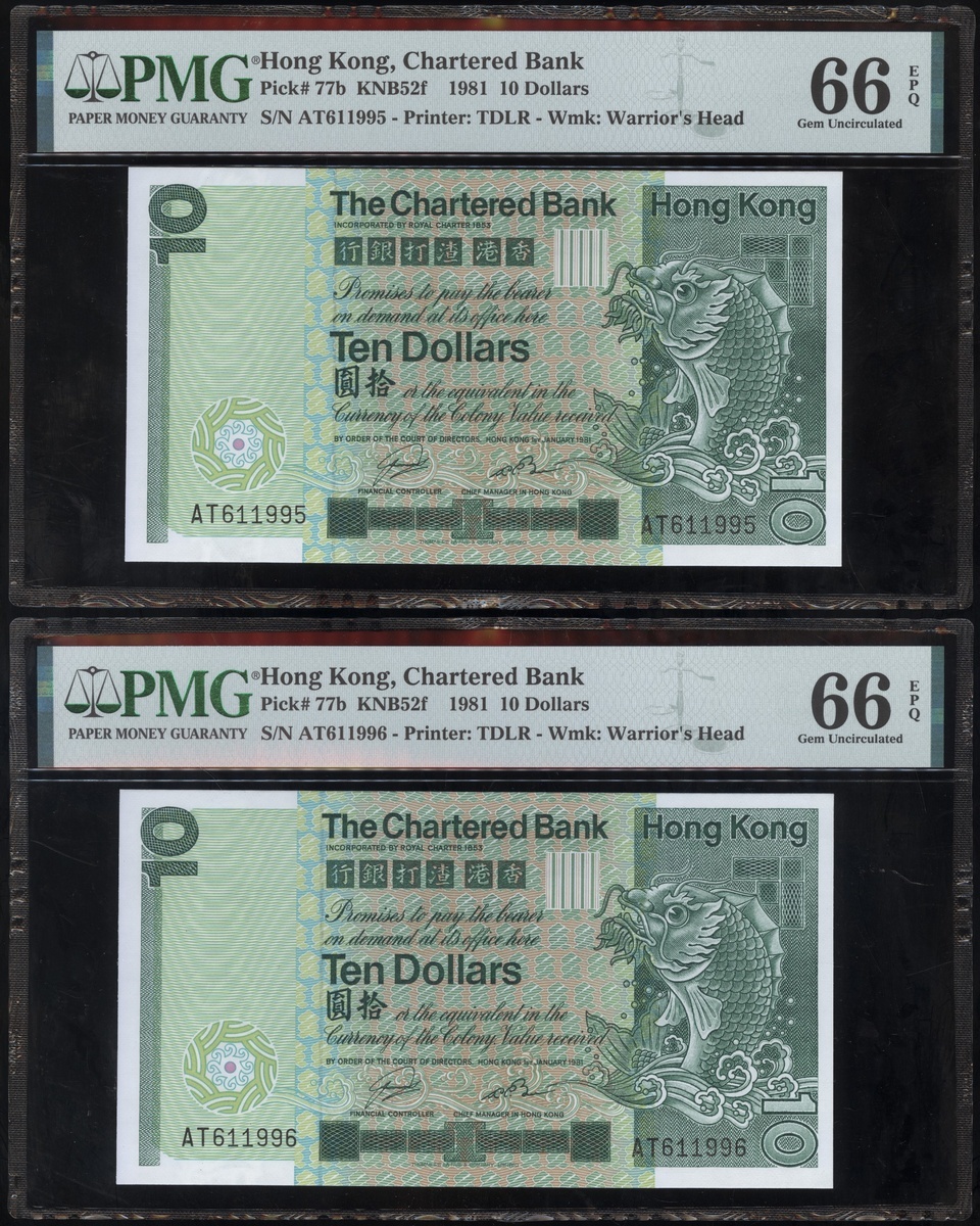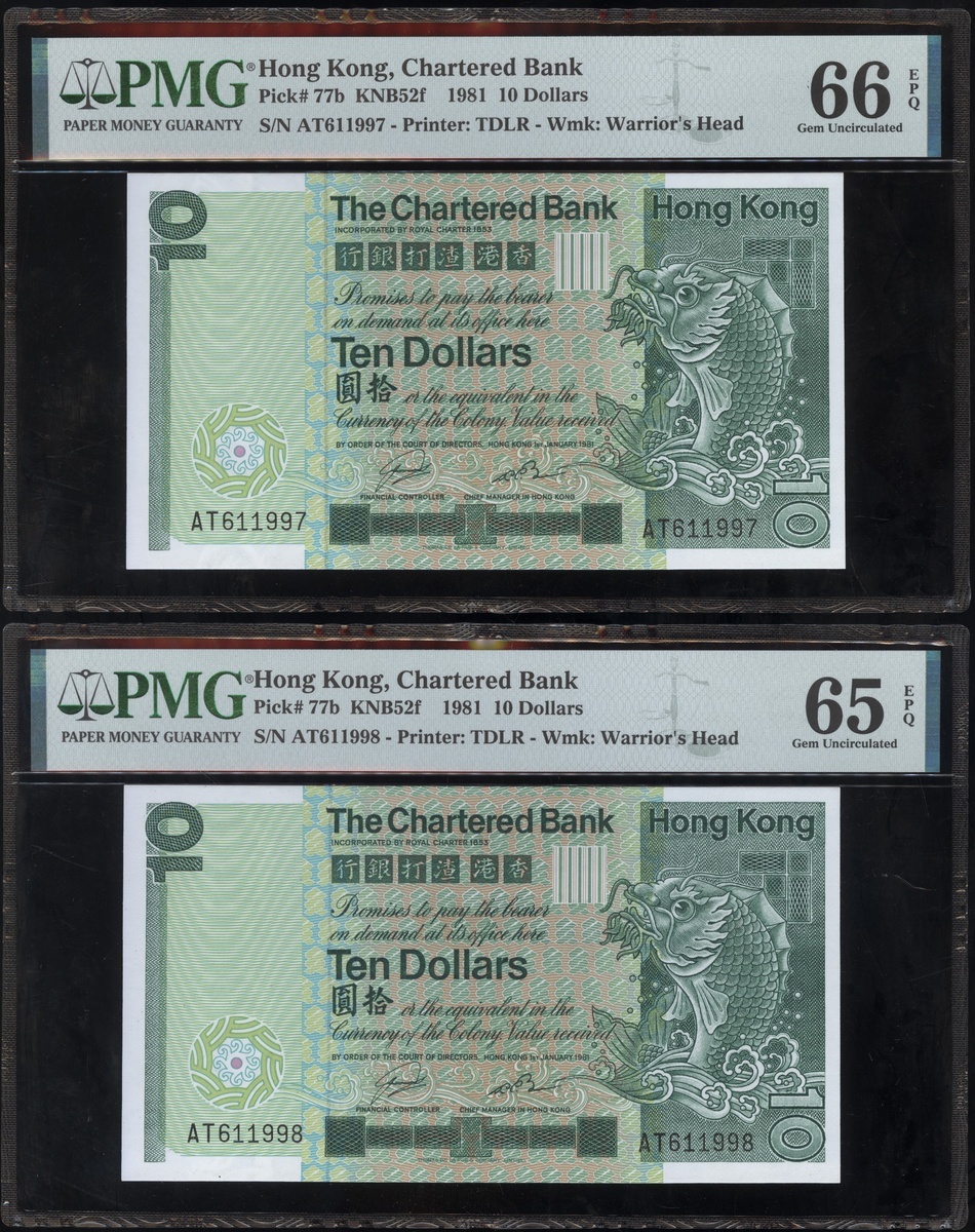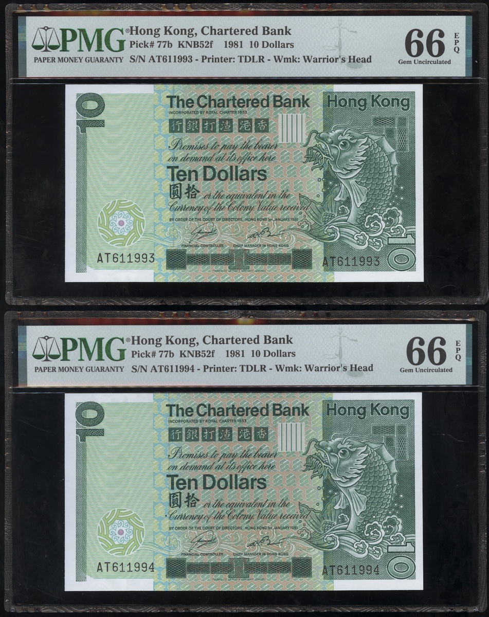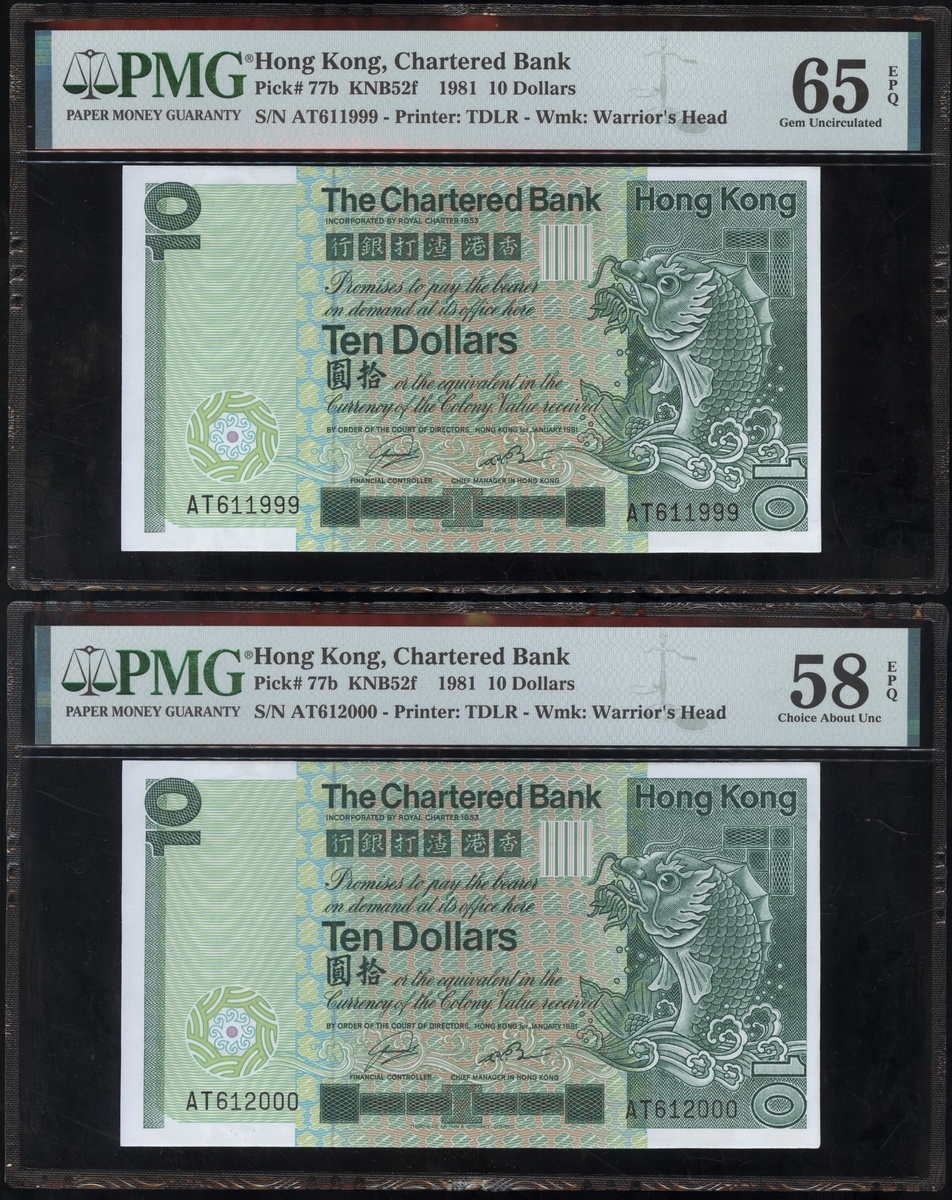 1977及1981年渣打銀行10元連號十枚共兩組,編號D9258151-D9258160 及AT611991-1200,PMG 58EPQ-67EPQ(20)