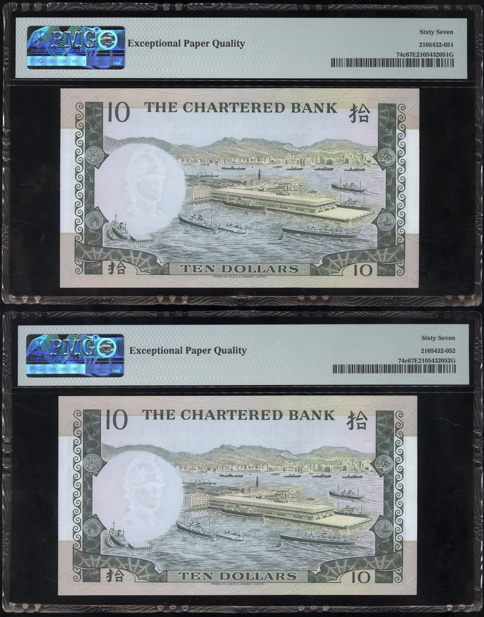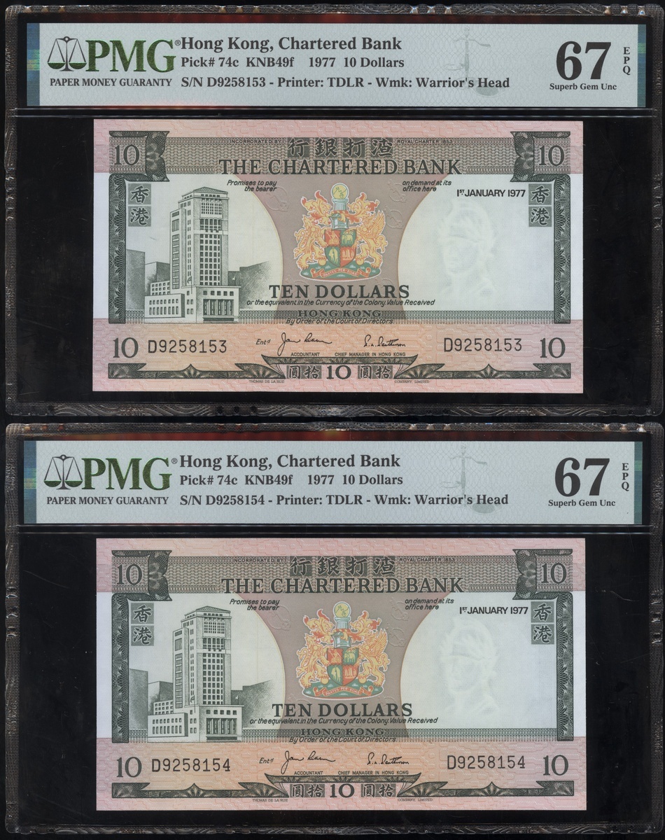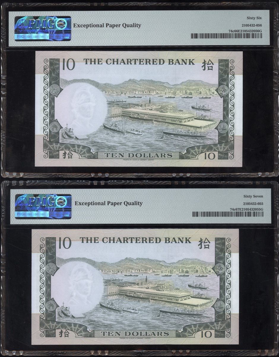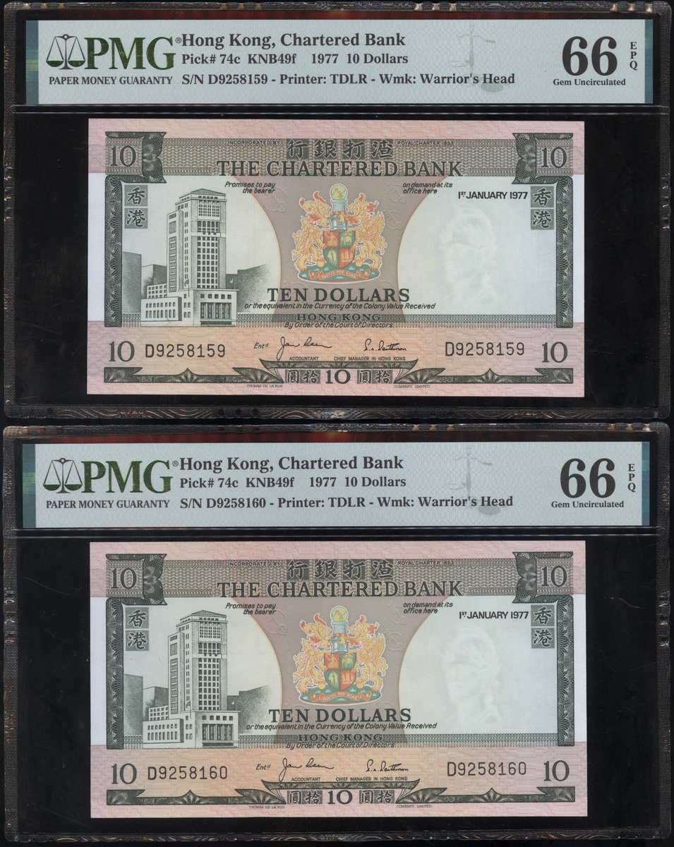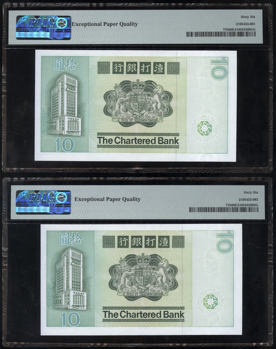 1977及1981年渣打銀行10元連號十枚共兩組,編號D9258151-D9258160 及AT611991-1200,PMG 58EPQ-67EPQ(20)