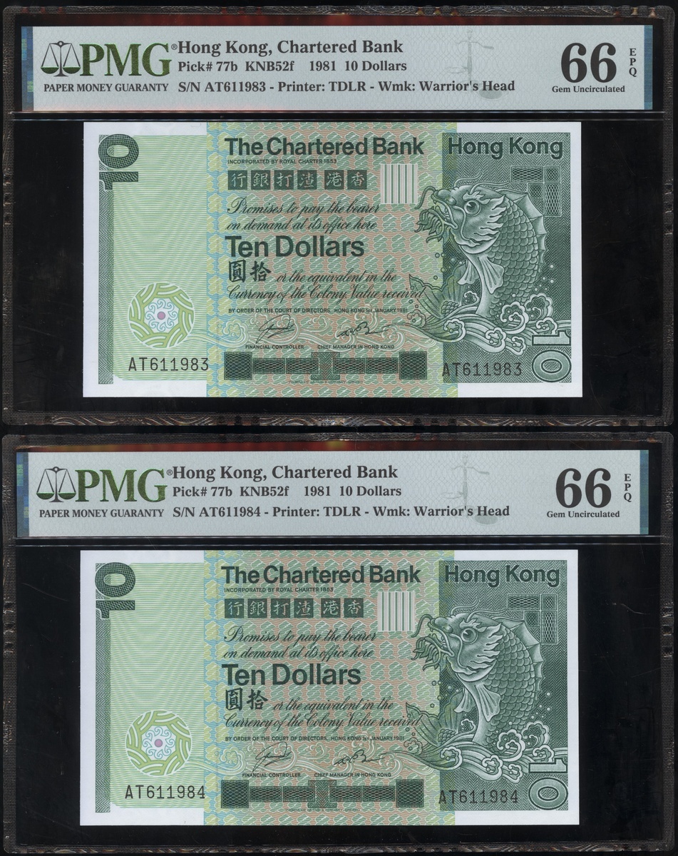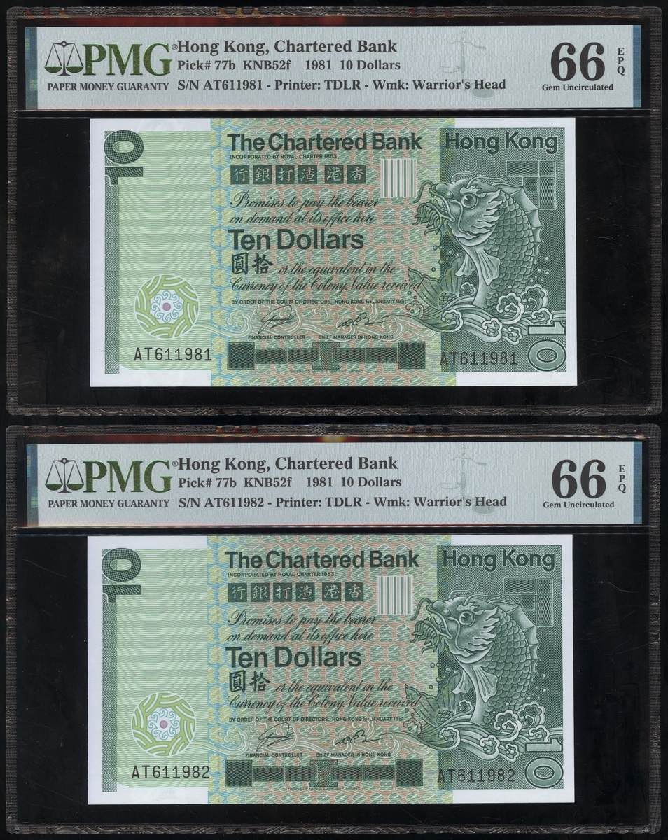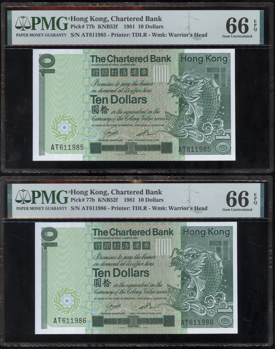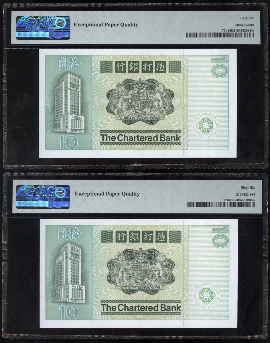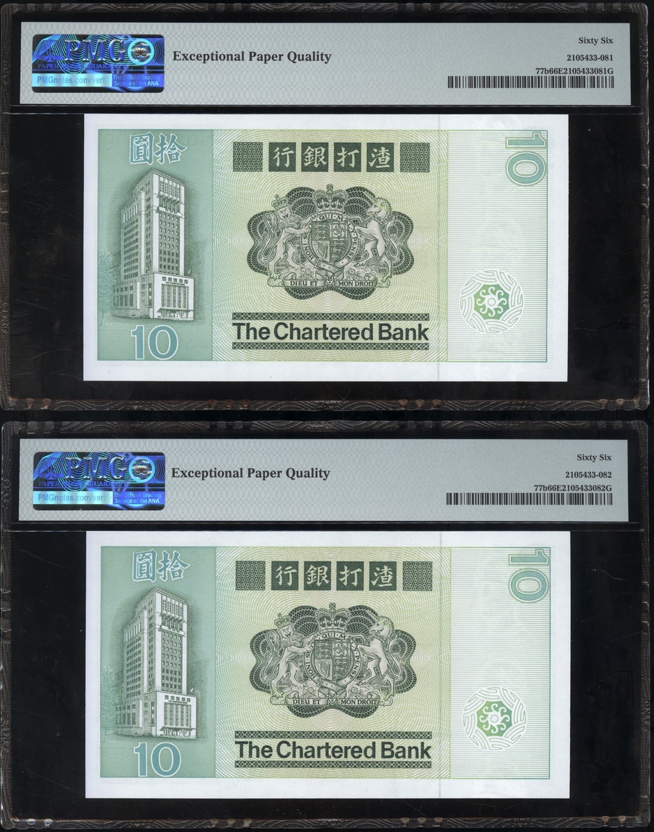 1977及1981年渣打銀行10元連號十枚共兩組,編號D9258161-D9258170 及AT611981-990,PMG 65EPQ-66EPQ(20)
