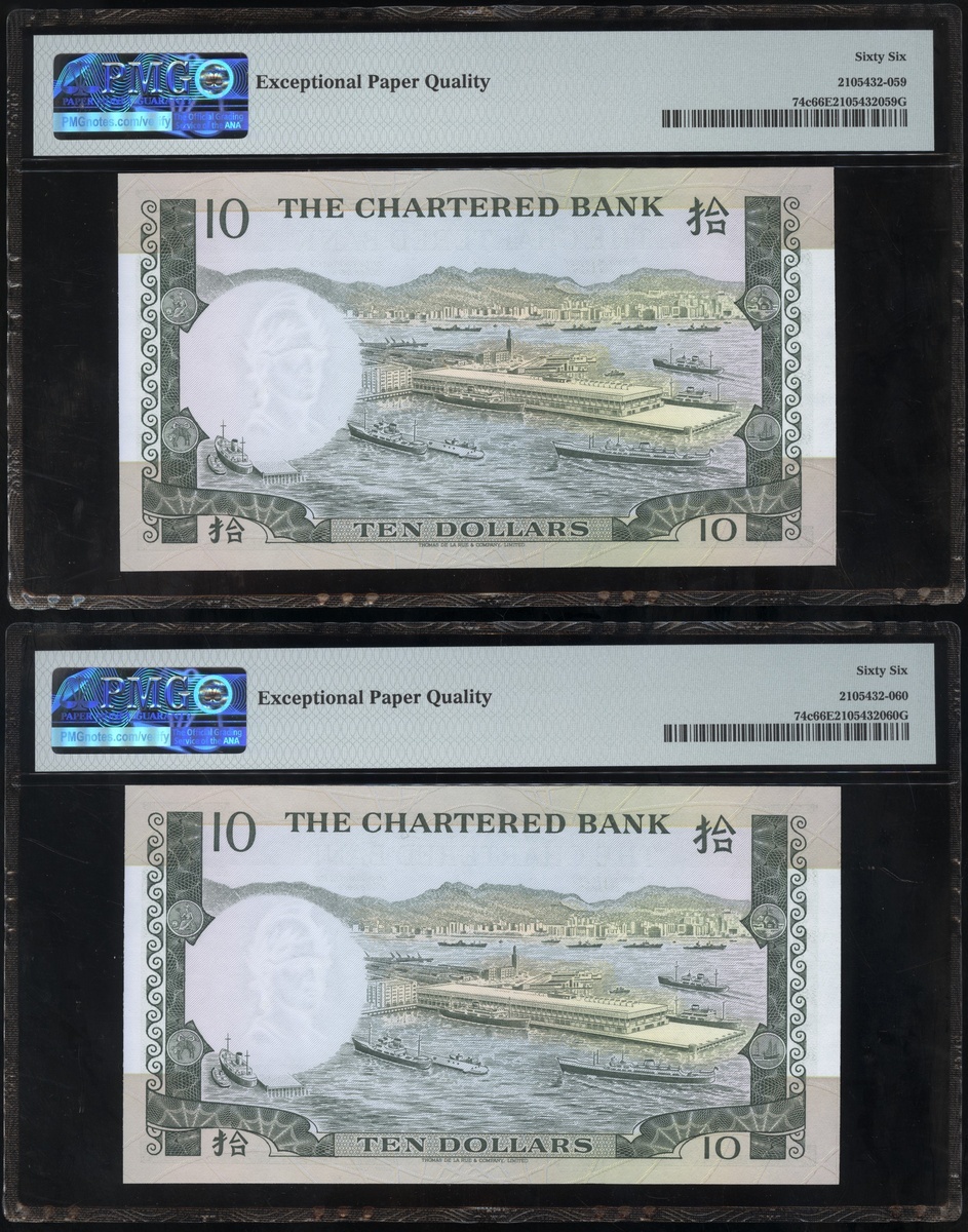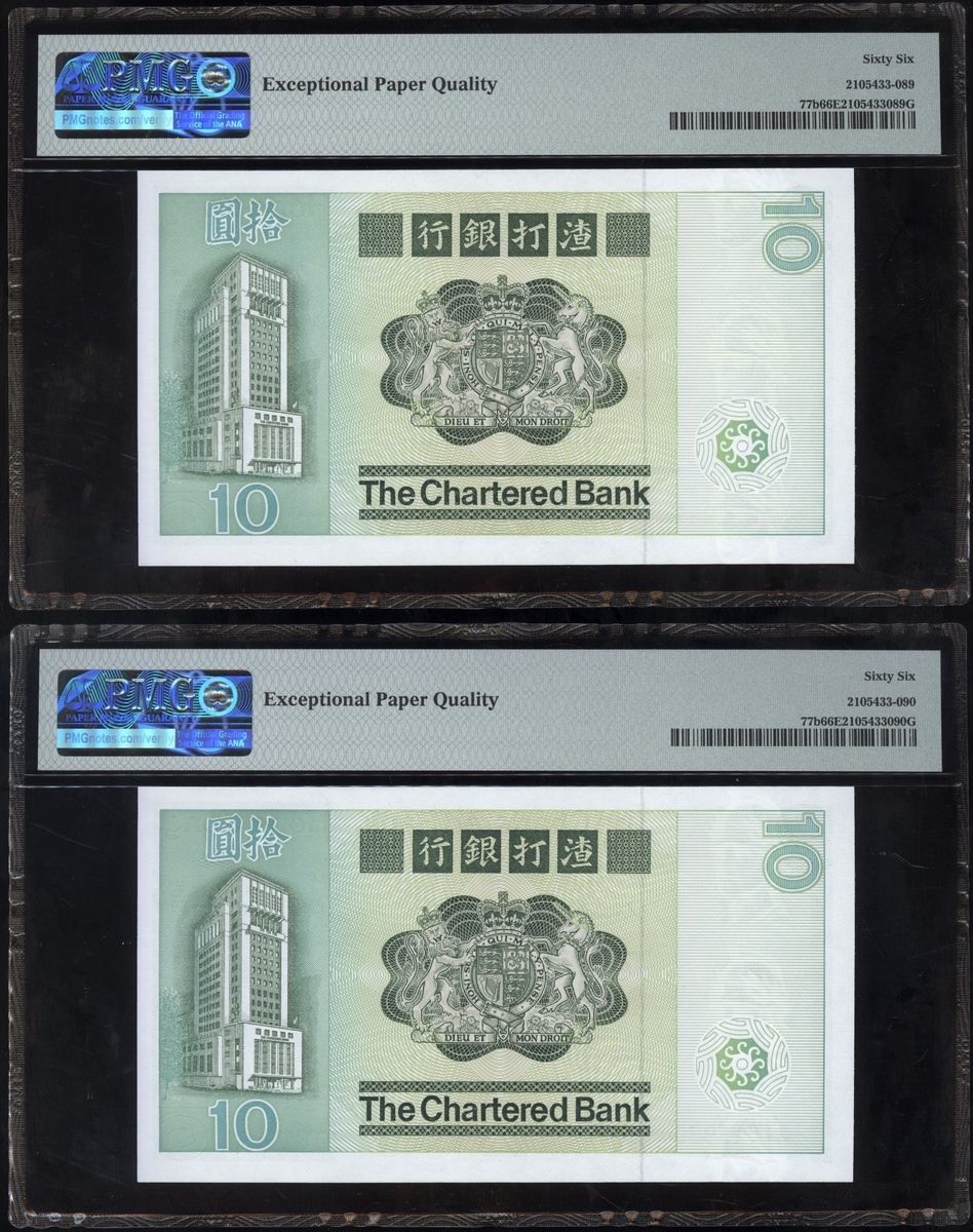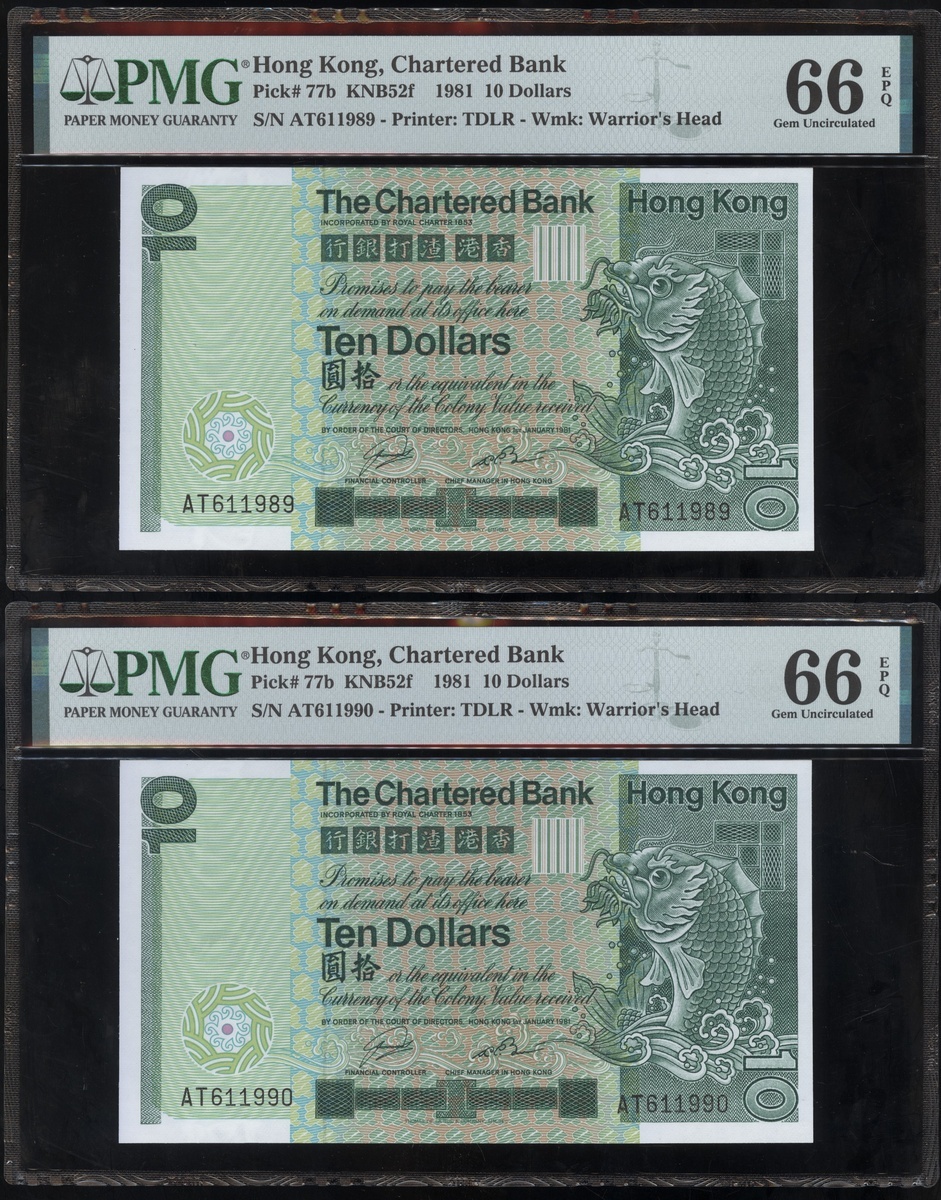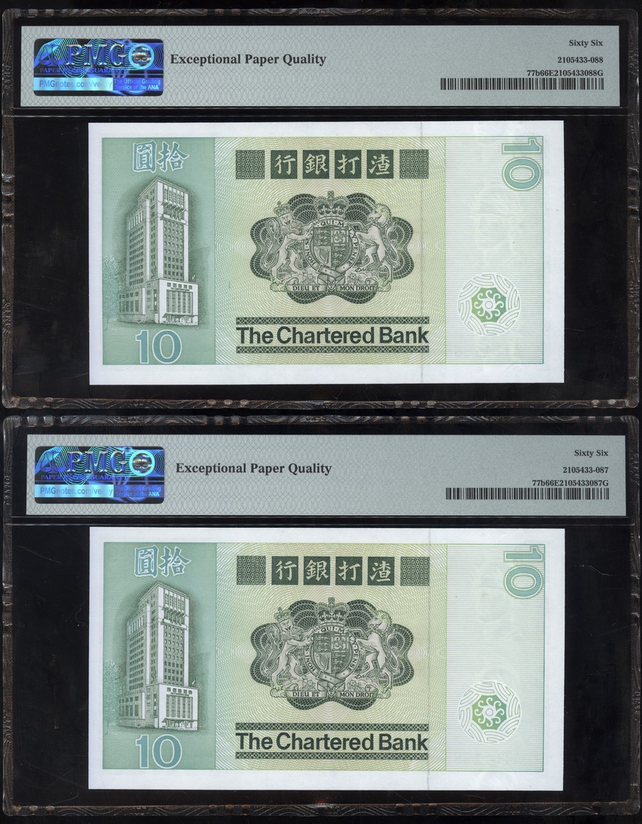 1977及1981年渣打銀行10元連號十枚共兩組,編號D9258161-D9258170 及AT611981-990,PMG 65EPQ-66EPQ(20)
