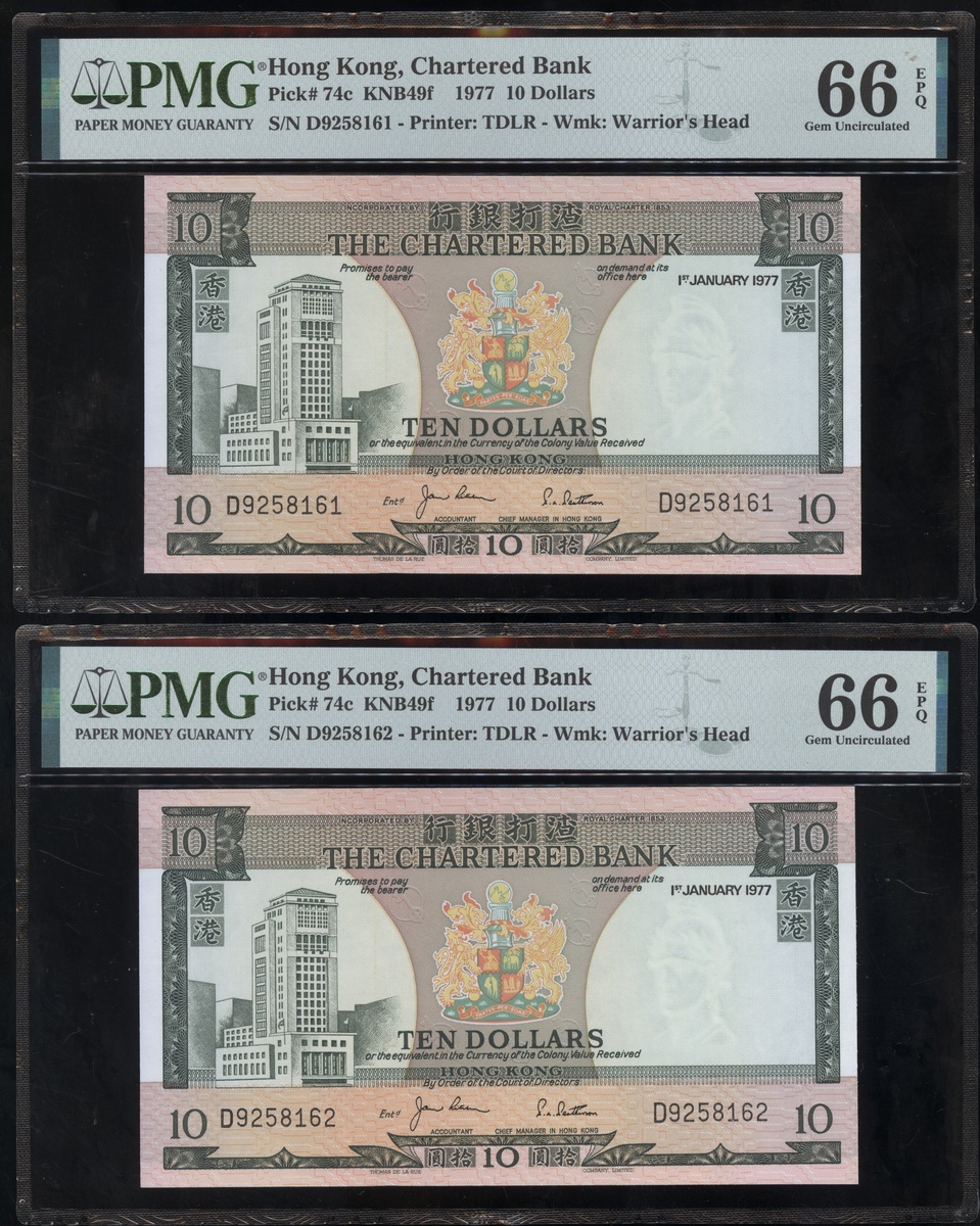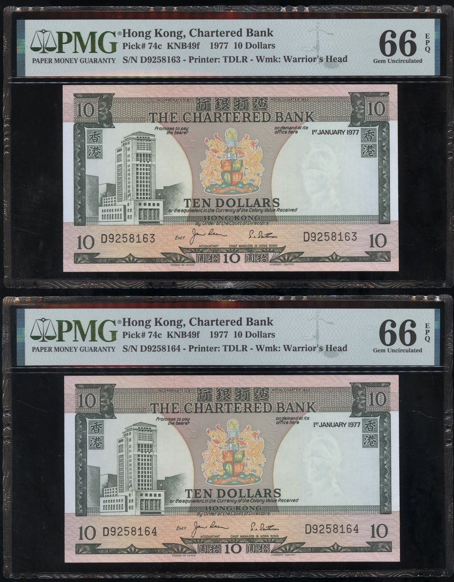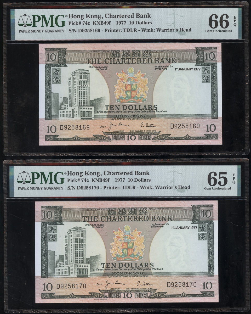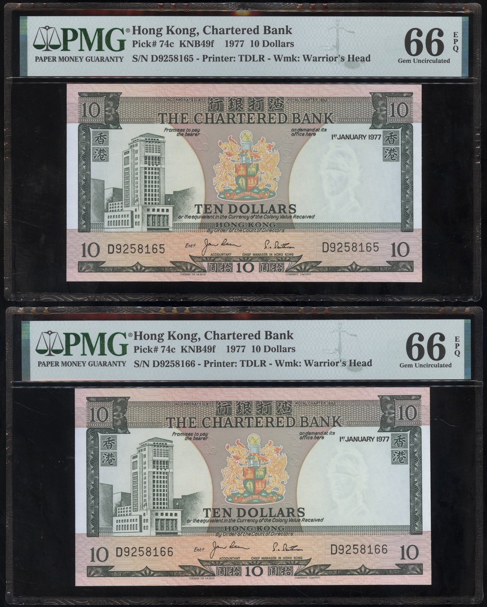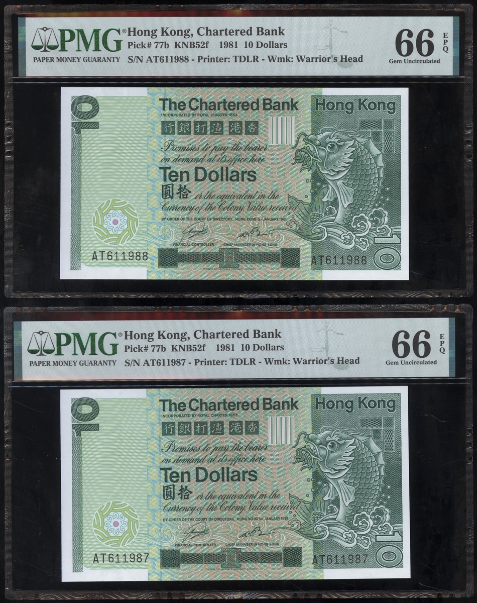 1977及1981年渣打銀行10元連號十枚共兩組,編號D9258161-D9258170 及AT611981-990,PMG 65EPQ-66EPQ(20)
