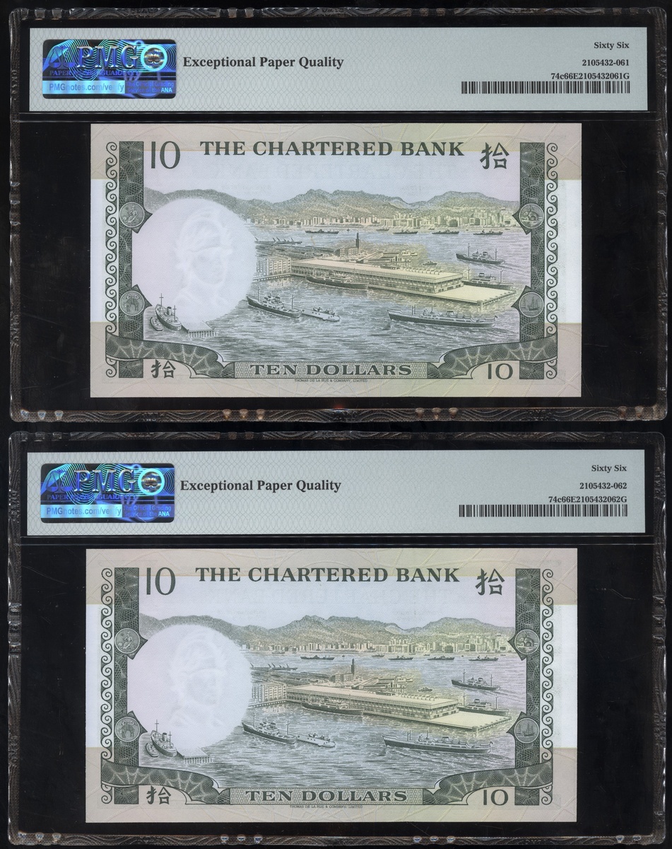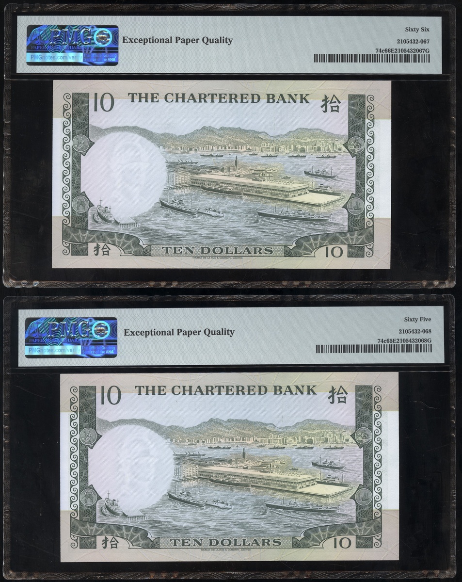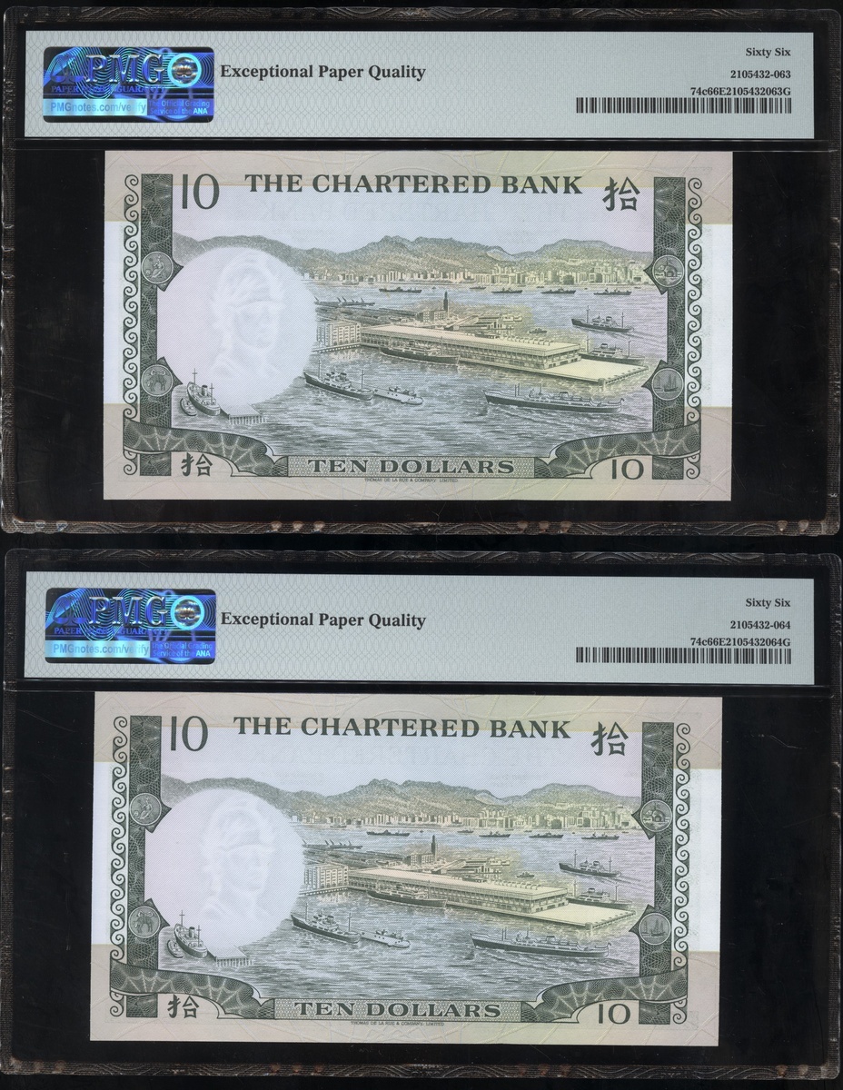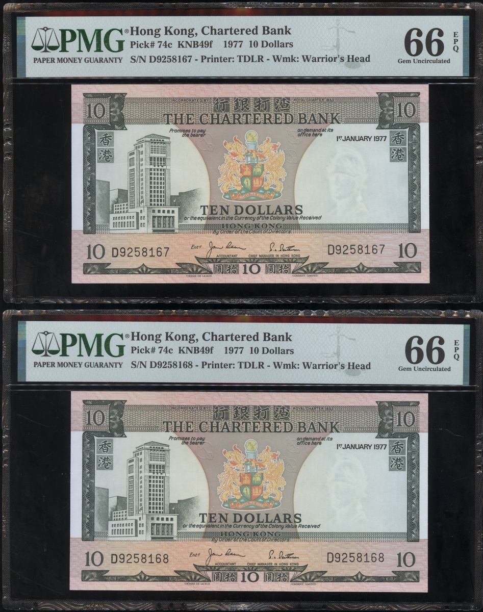1977及1981年渣打銀行10元連號十枚共兩組,編號D9258161-D9258170 及AT611981-990,PMG 65EPQ-66EPQ(20)
