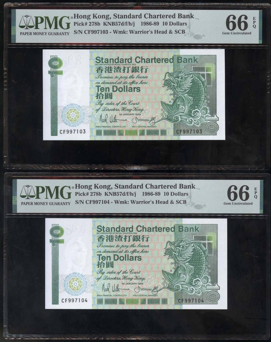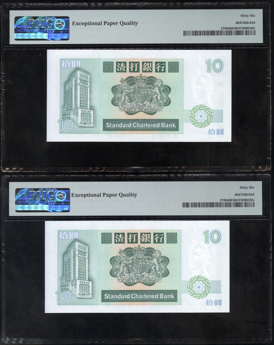 1988年香港渣打銀行10元兩枚連號,編號CF997103及CF997104,均PMG66EPQ(2)