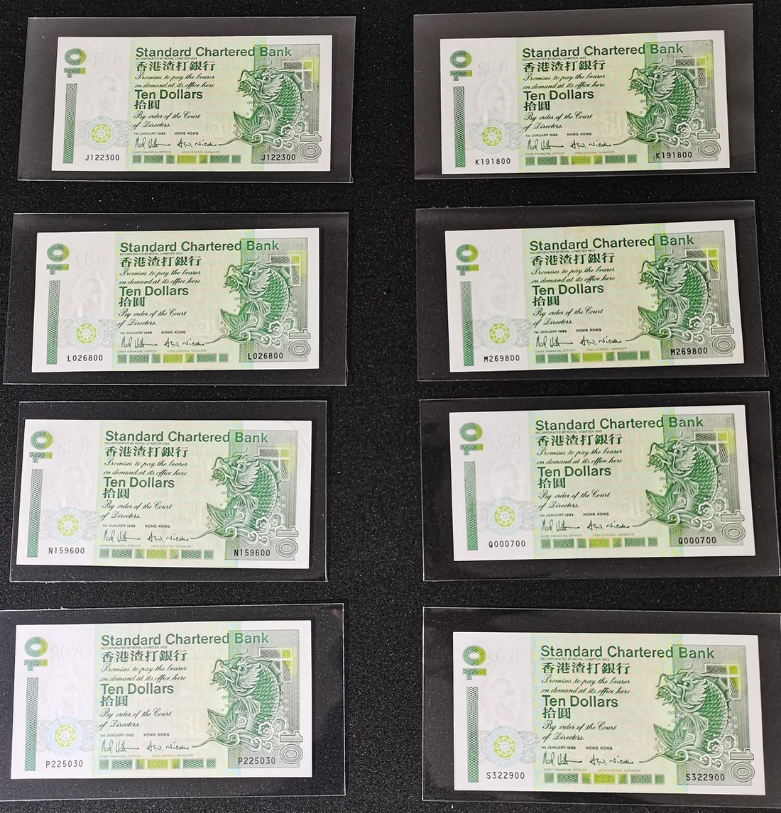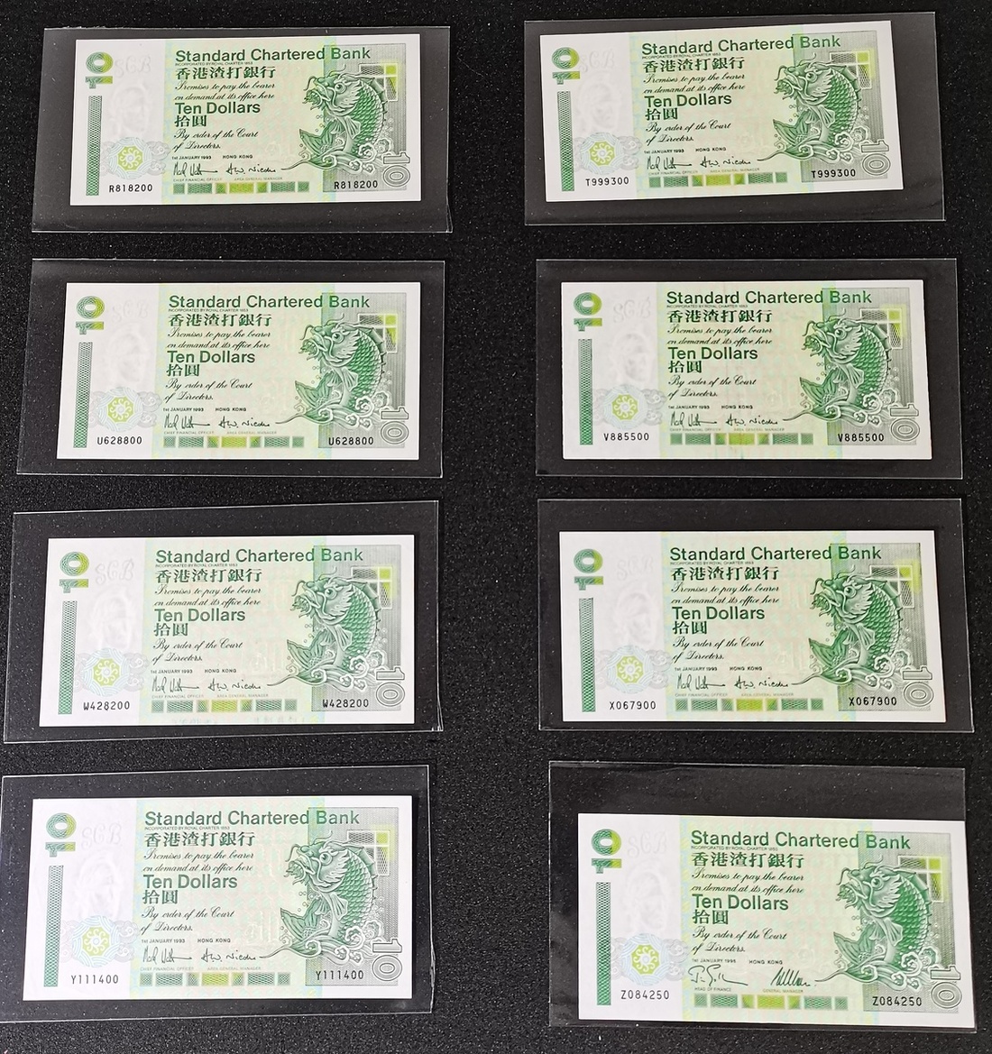 1993/95年渣打銀行一組24枚10元,編號包含A-Z所有字軌,大部分約UNC品相,M字軌XF品相,有些有銹漬,建議現場檢視