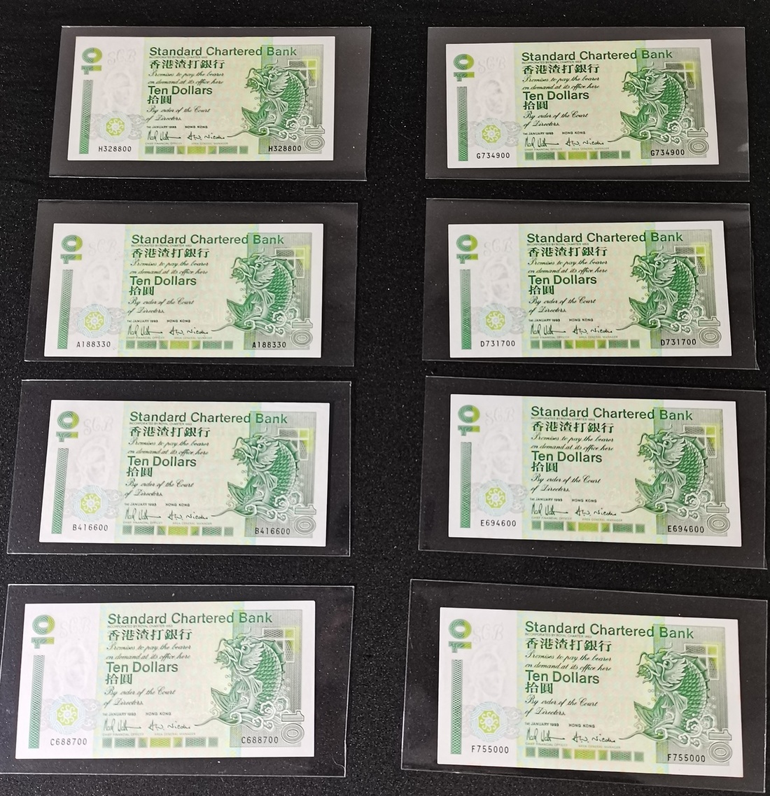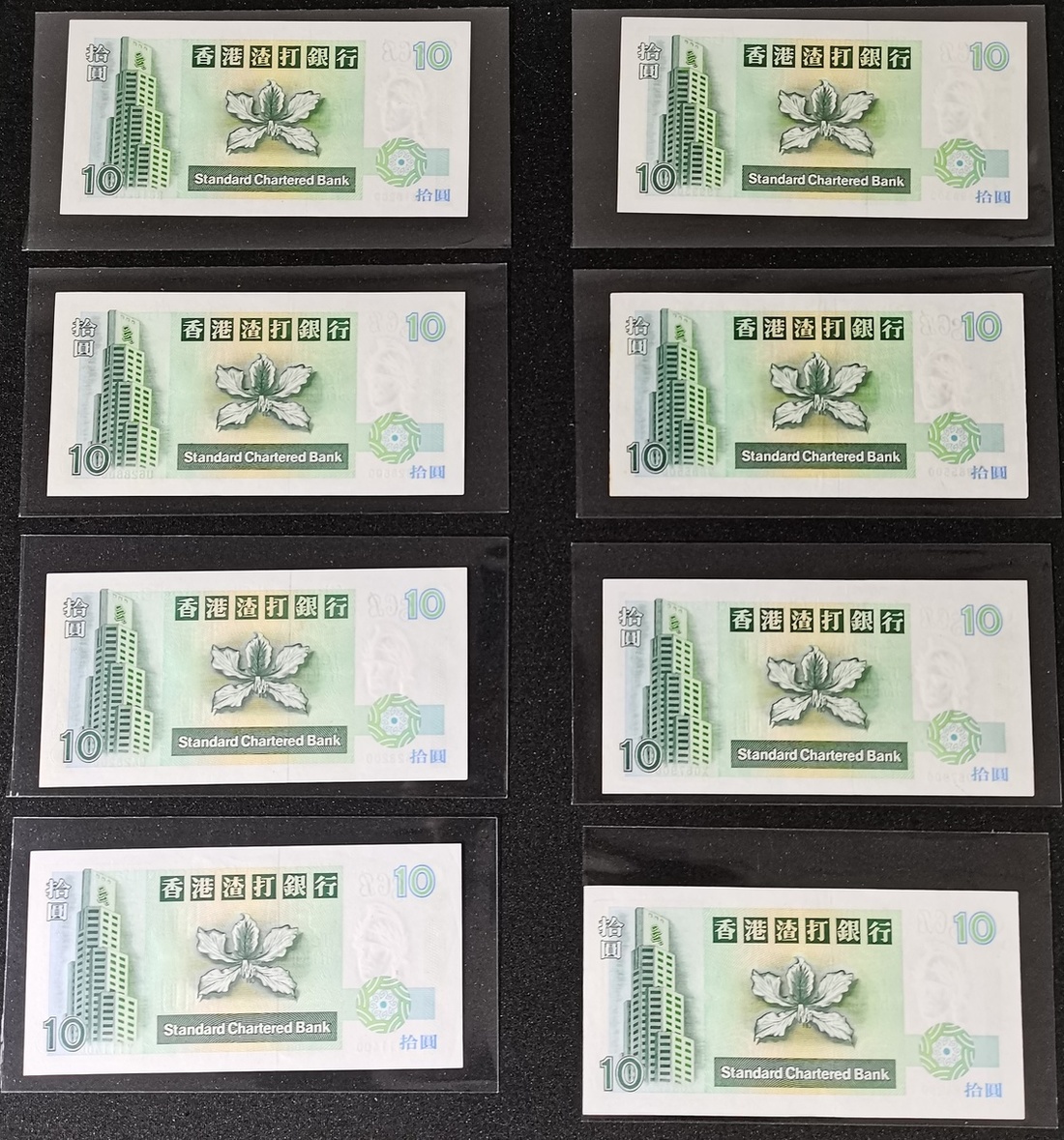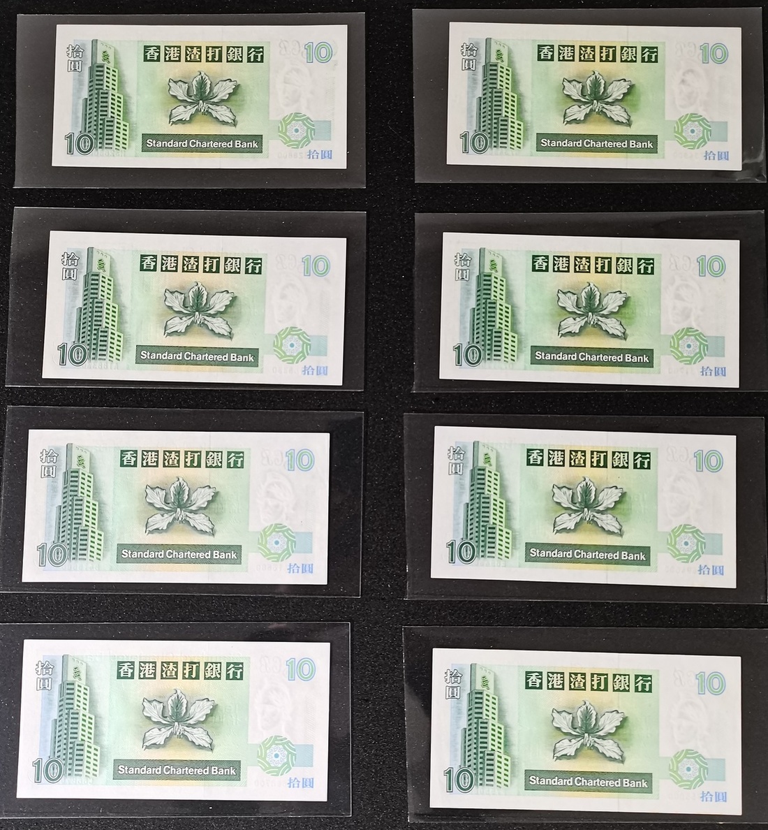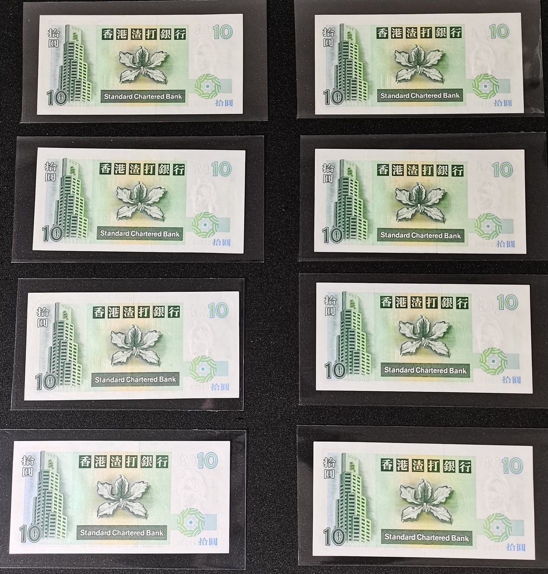 Standard Chartered Bank, a group of 24x $10, prefix A-Z are included, prefix A-Y from 1993 series, and replacement prefix Z from 1995 series, prefix Q with fancy number 000700,