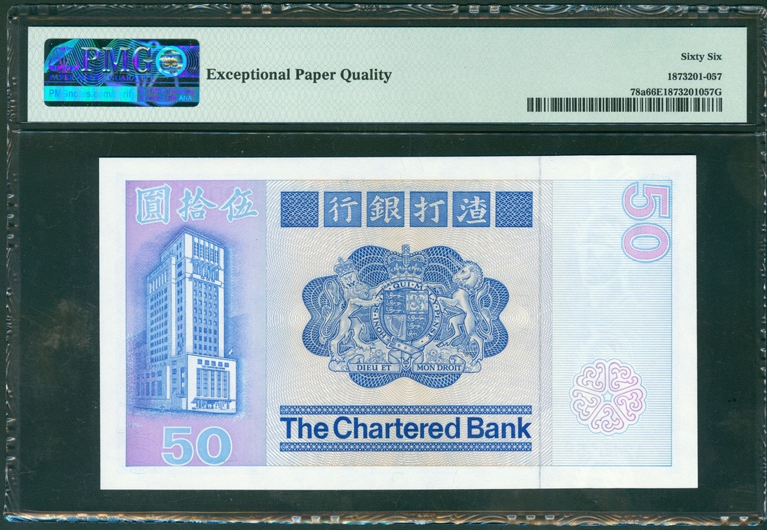 The Chartered Bank, $50, 1.1.1979, first prefix serial number A210156, (Pick 78a), PMG 66EPQ Gem Uncirculated.
