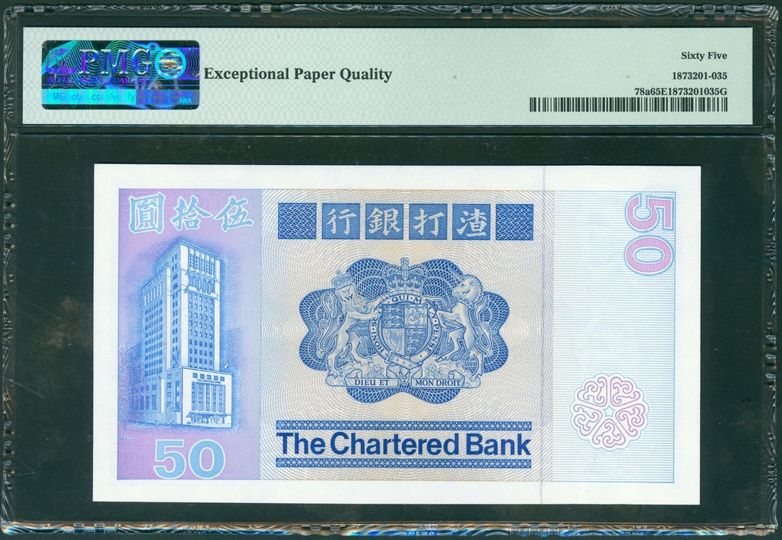 The Chartered Bank, $50, 1.1.1979, first prefix serial number A210124, (Pick 78a), PMG 65EPQ Gem Uncirculated.
