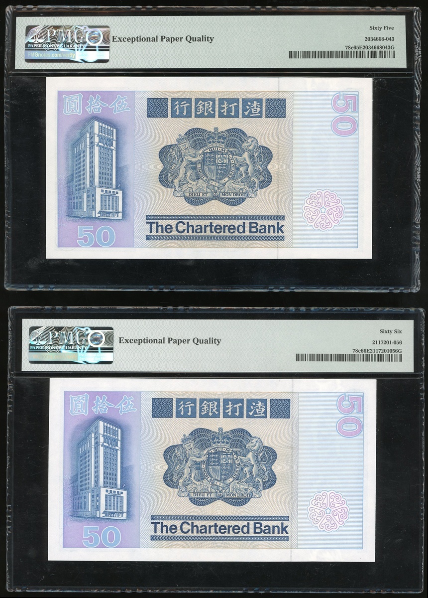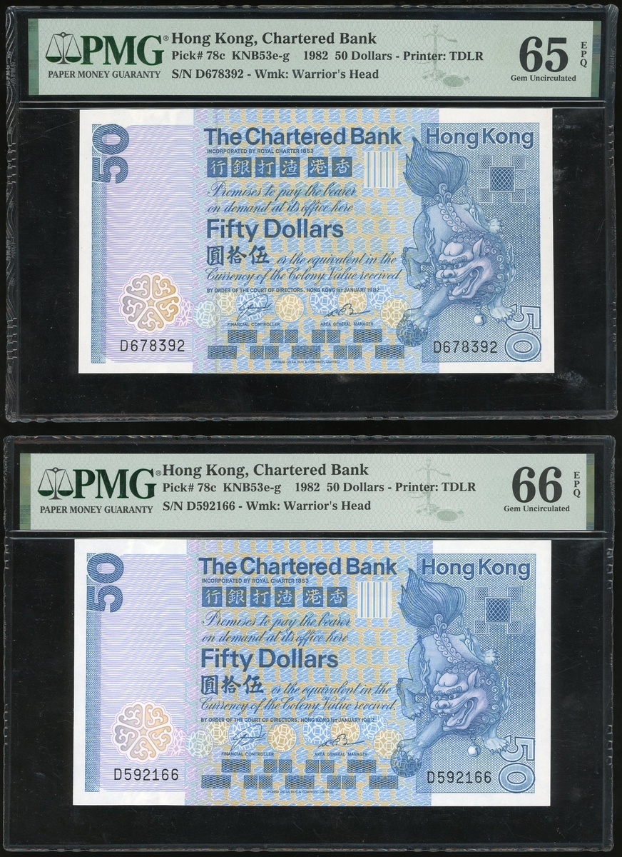 1982年渣打銀行一組兩枚50元,編號D592166及D678392,分別評PMG 66EPQ及65EPQ