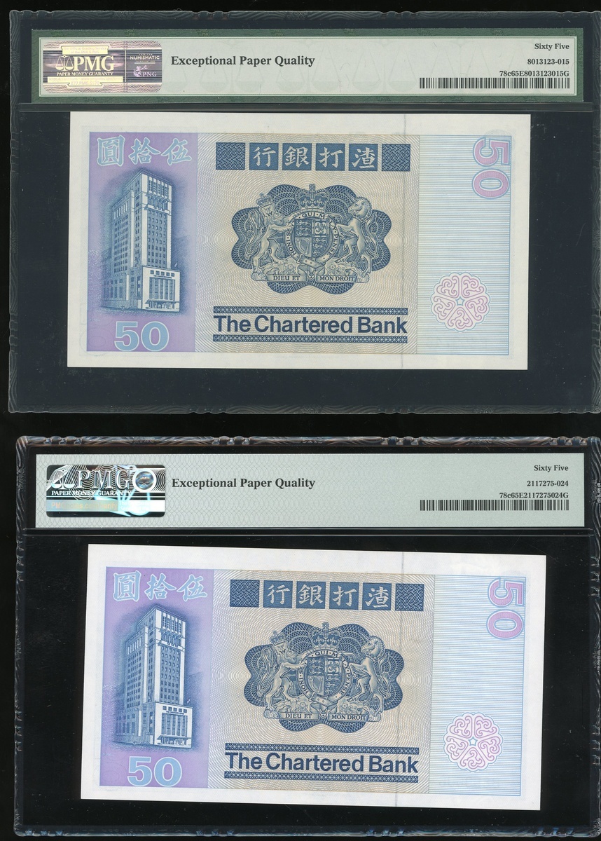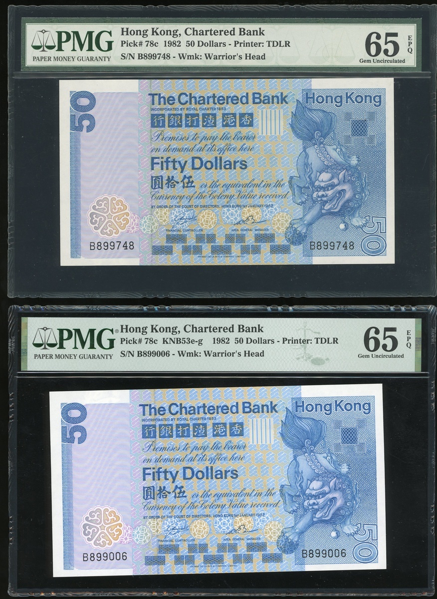1982年渣打銀行一組兩枚50元,編號B899748及B899006,均PMG 65EPQ