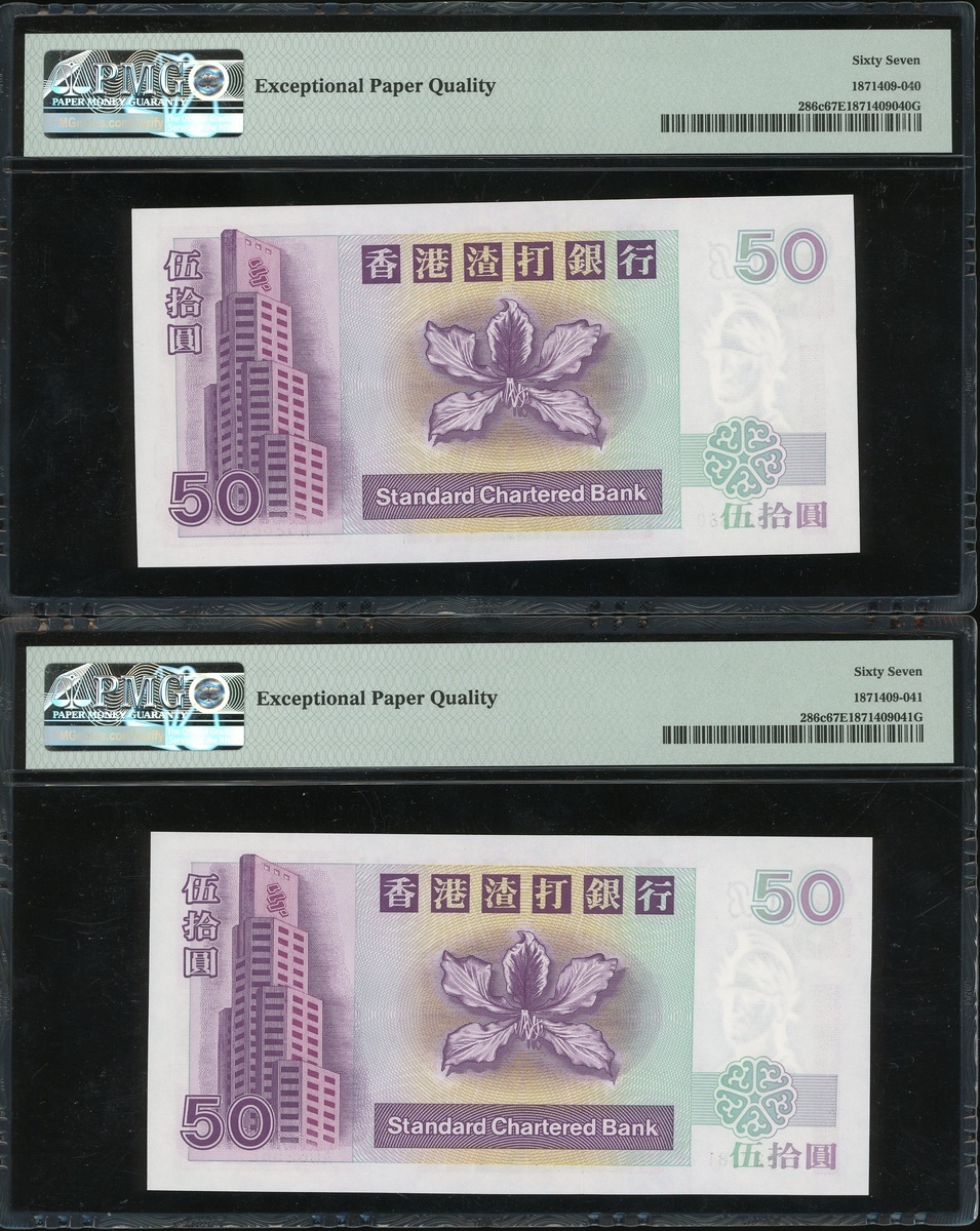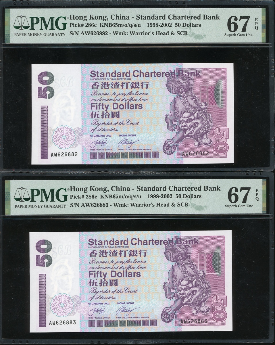 2002年渣打銀行一組四枚50元,連號AW626880-883,均PMG 67EPQ