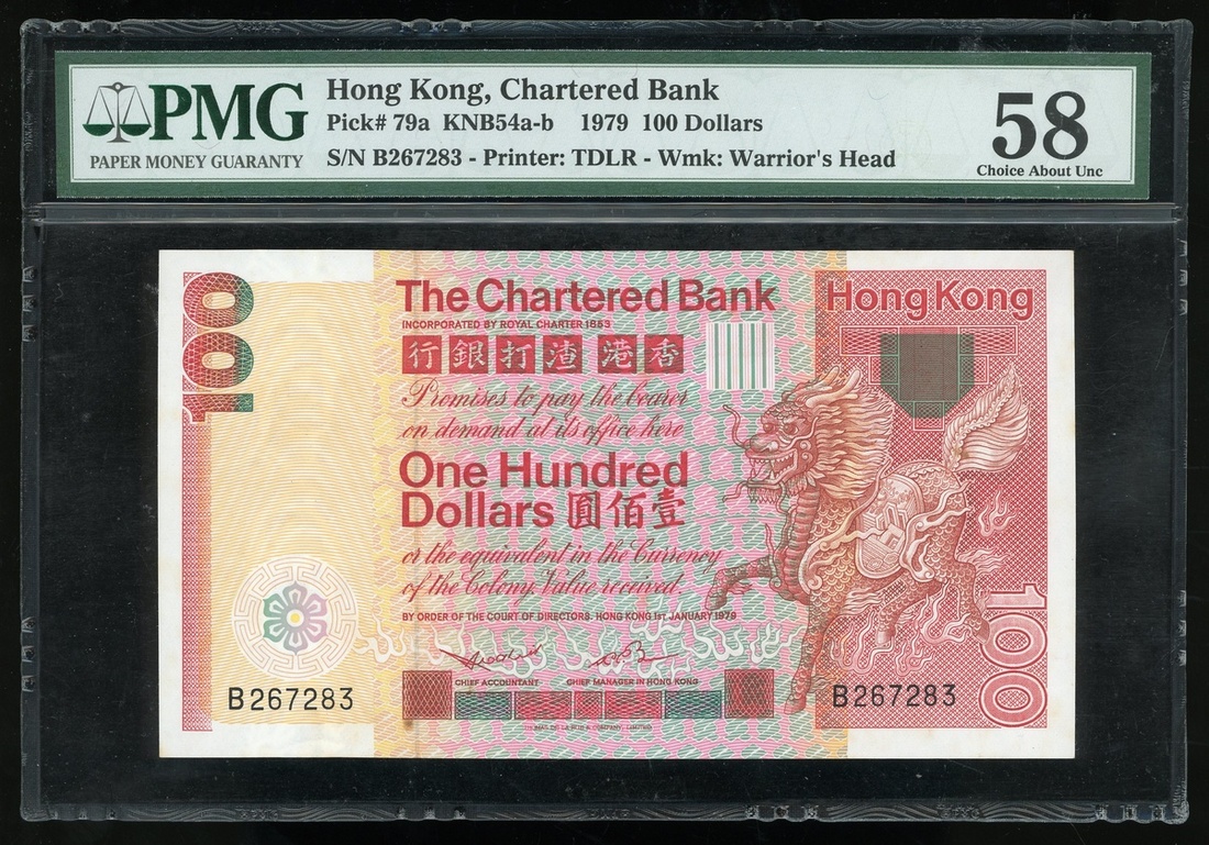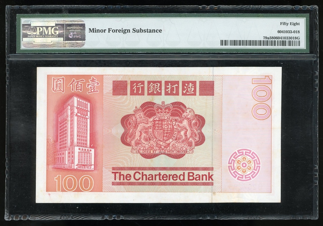 1979年渣打銀行100元,編號B267283,PMG 58,有些微外附物