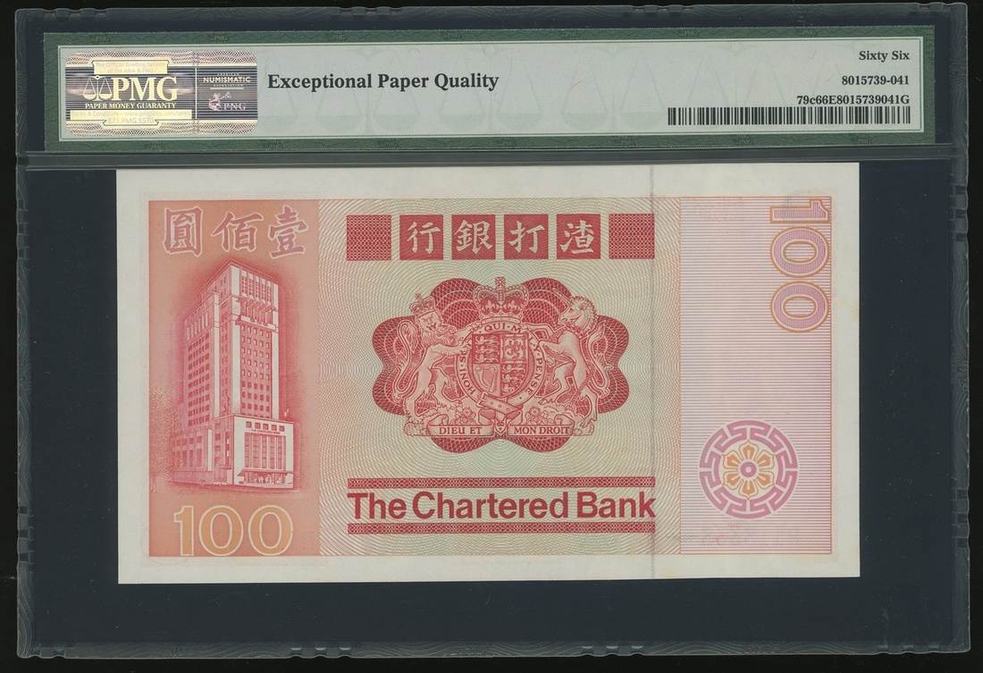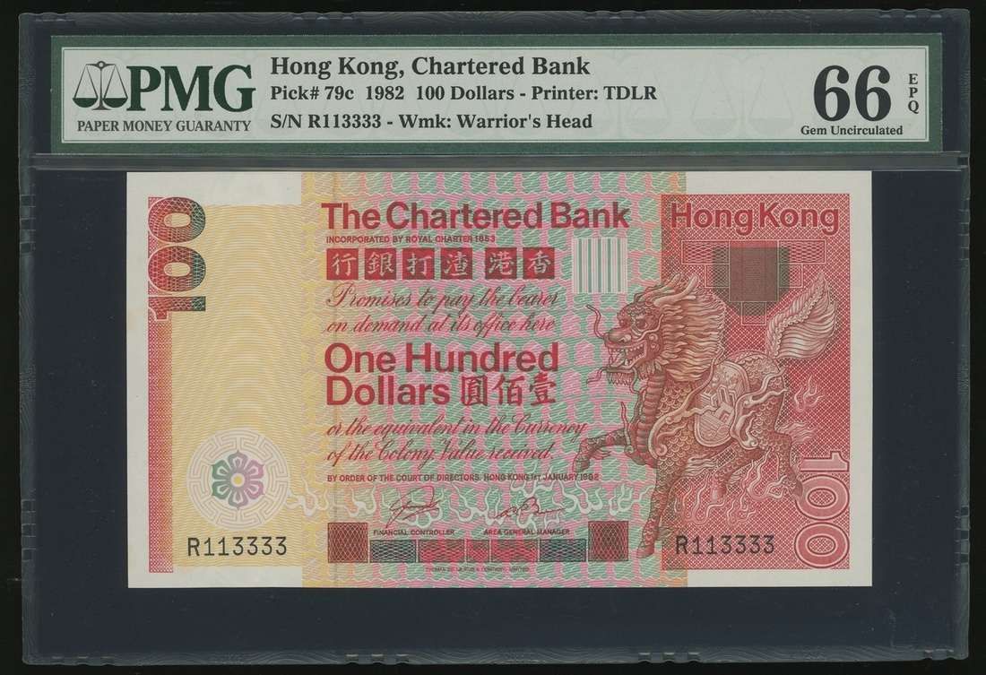 1982年渣打銀行100元,趣味號R113333,PMG 66EPQ