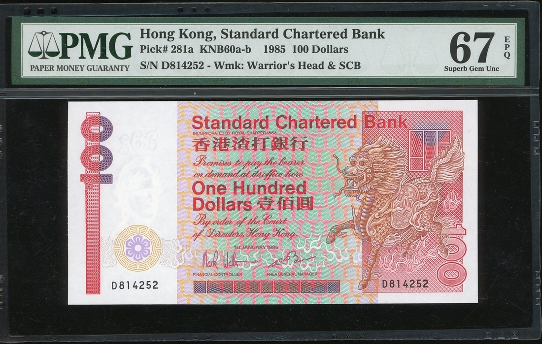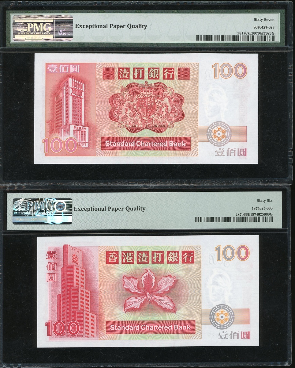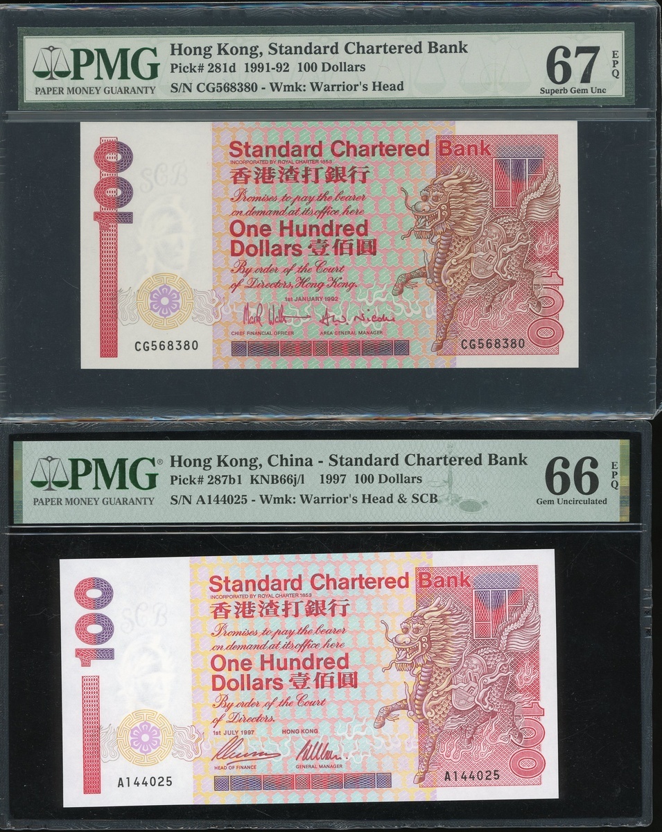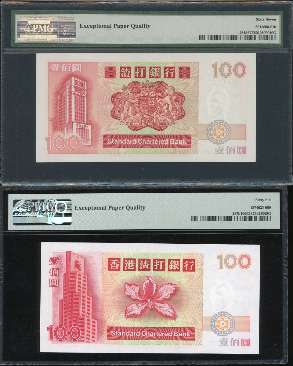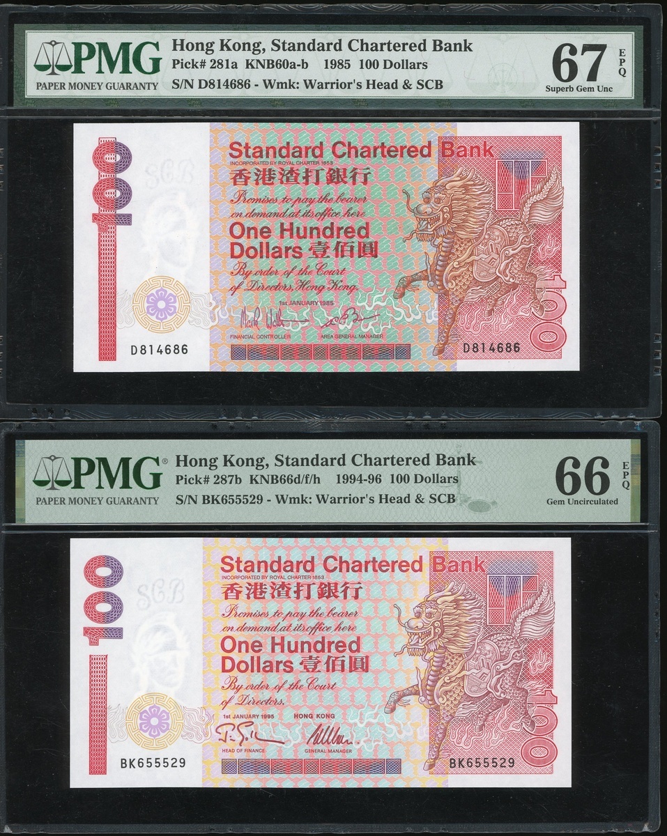1985/92/95/97年渣打銀行一組5枚100元,編號D814252,D814686,CG568380,BK655529及A144025,均PMG 67EPQ及66EPQ