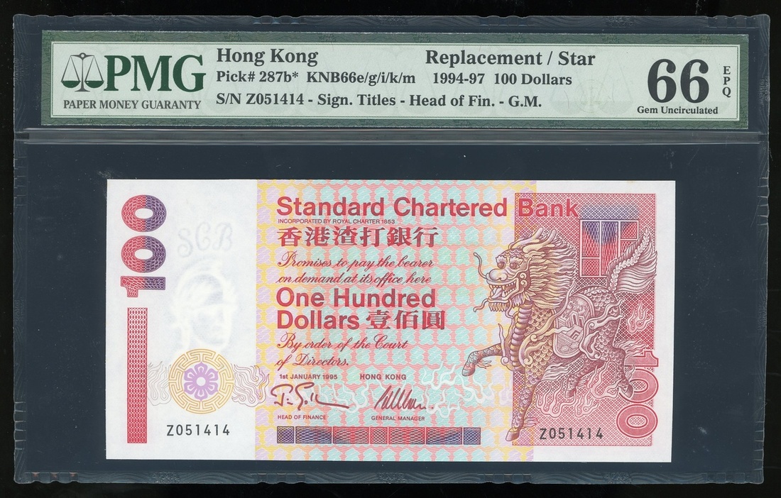 Standard Chartered Bank, $100, replacement, 1.1.1995, serial number Z051414, (Pick 287b*), PMG 66EPQ Gem Uncirculated.