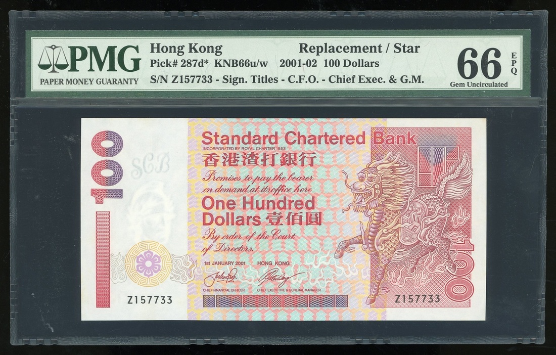 Standard Chartered Bank, $100, replacement, 1.1.2001, serial number Z157733, (Pick 287d*), PMG 66EPQ Gem Uncirculated.