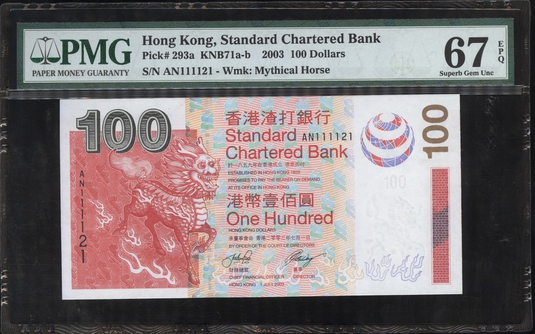 2003年香港渣打銀行100元,編號AN111121,PMG67EPQ