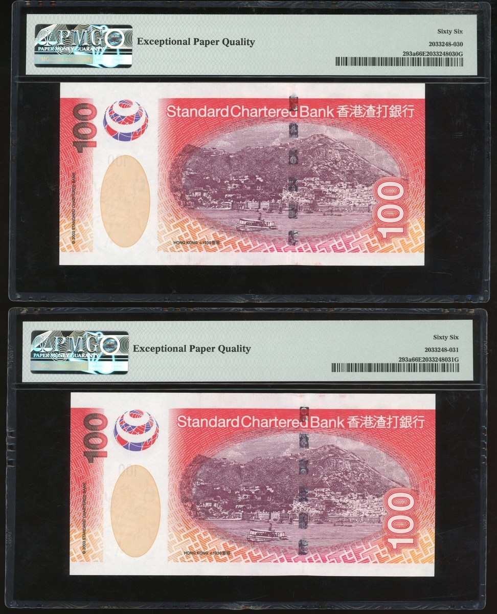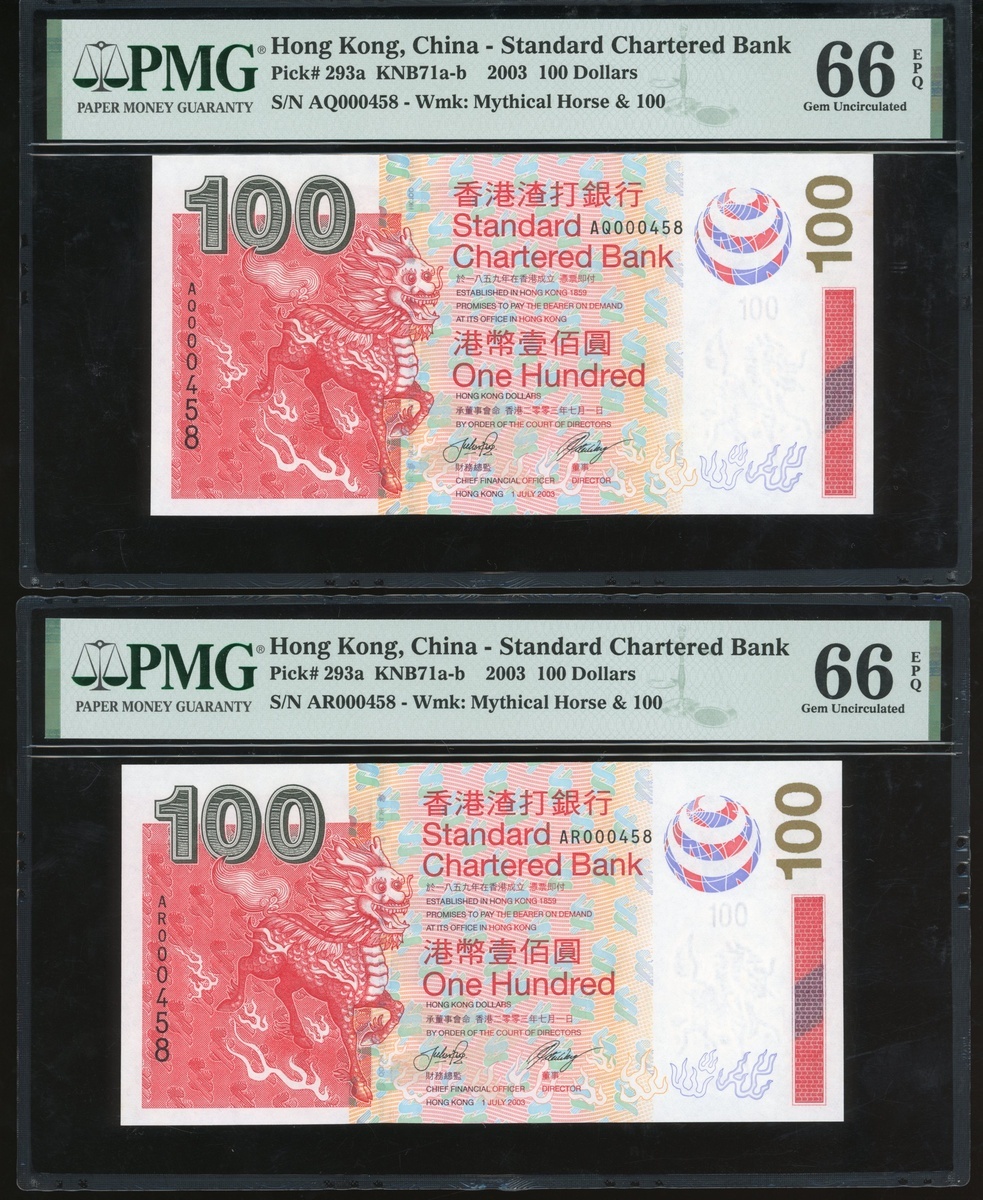 2003年渣打銀行100元2枚,不同字軌相同編號AQ000458 及 AR000458,均評PMG 66EPQ