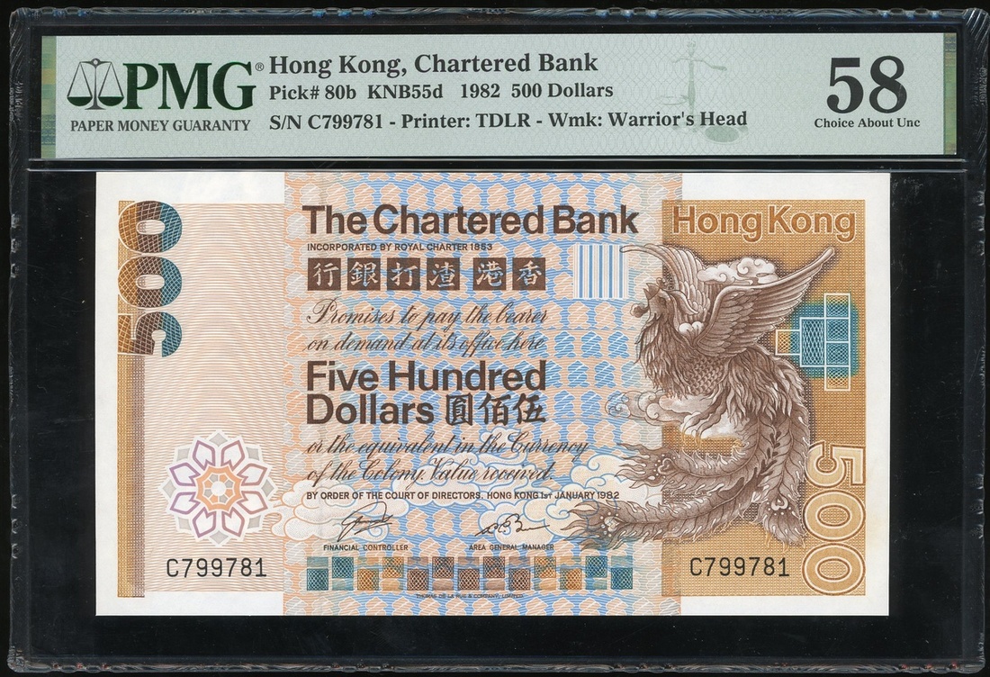 1982年渣打銀行500元,編號C799781,PMG 58