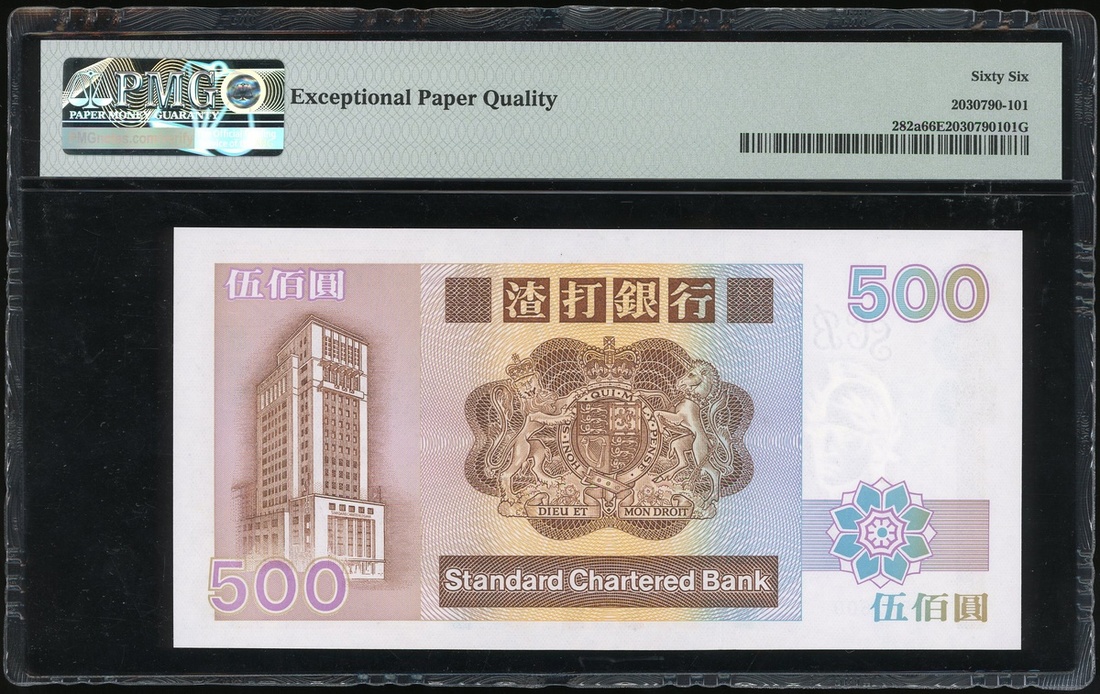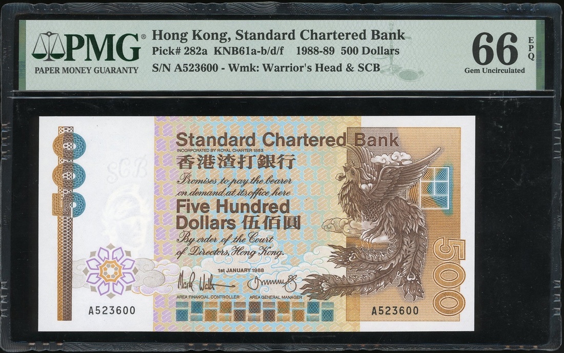 1992年渣打銀行500元,編號A523600,PMG 66EPQ