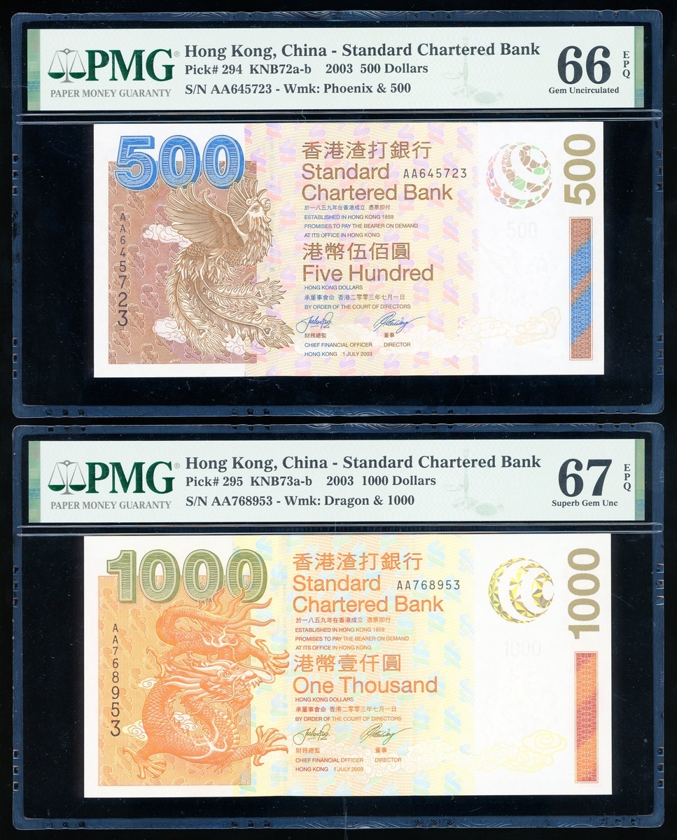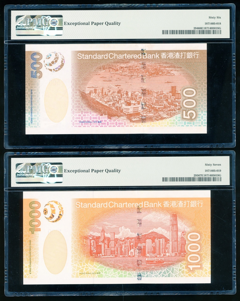 1993年渣打銀行500元及1000元一對,AA字軌「亂蛇」編號645723及768953,分別評PMG 66EPQ及67EPQ