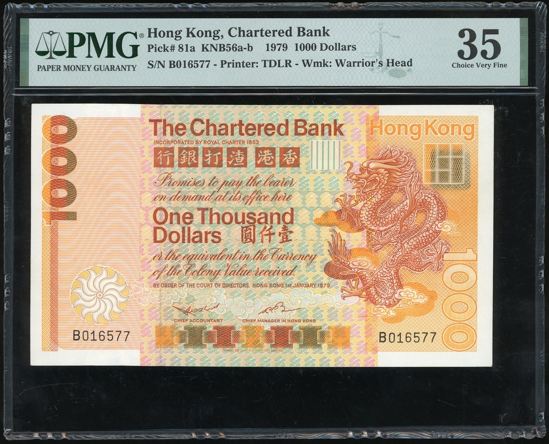 The Chartered Bank, $1000, 1.1.1979, serial number B016577, (Pick 81a), PMG 35 Choice Very Fine