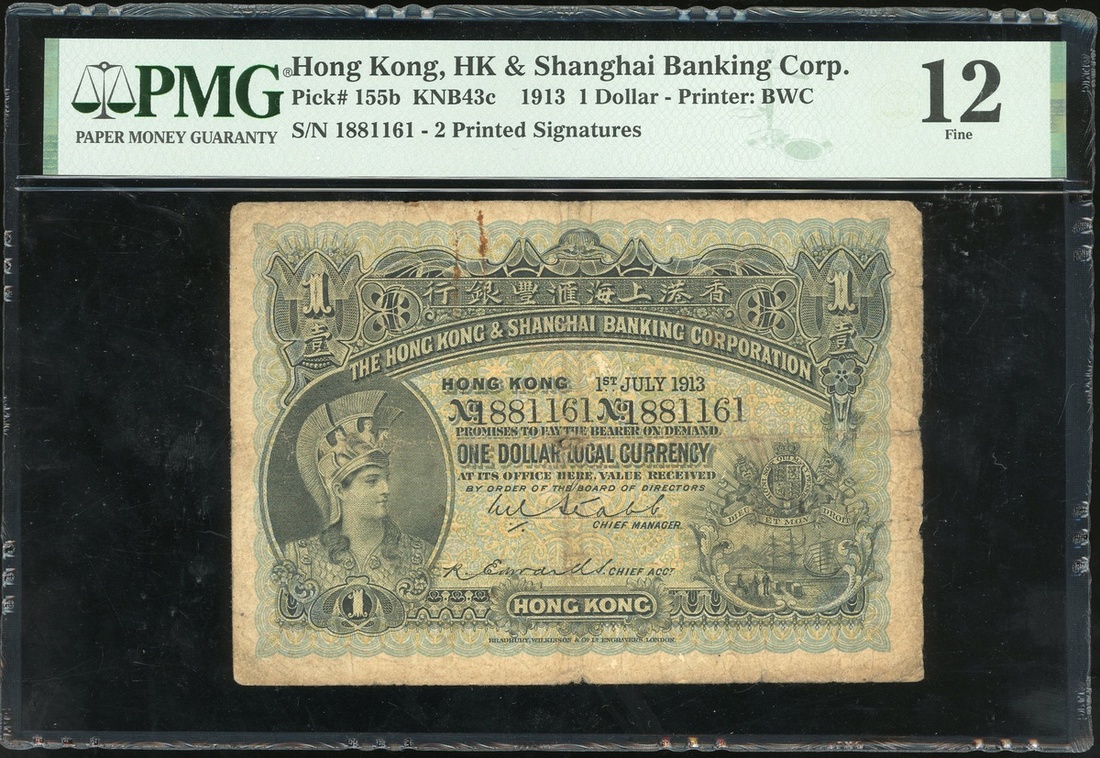 1913年香港上海匯豐銀行1元,編號1881161,PMG 12(有漬)