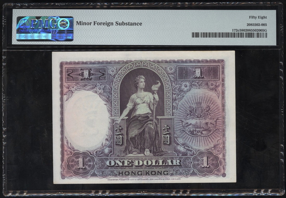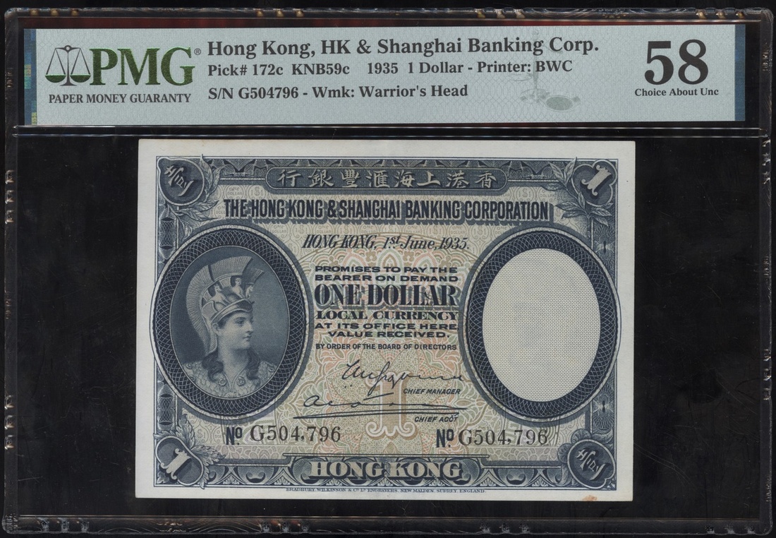 The Hongkong and Shanghai Banking Corporation, $1, 1.6.1935, serial number G504796, (Pick 172c), PMG 58EPQ Choice About Uncirculated