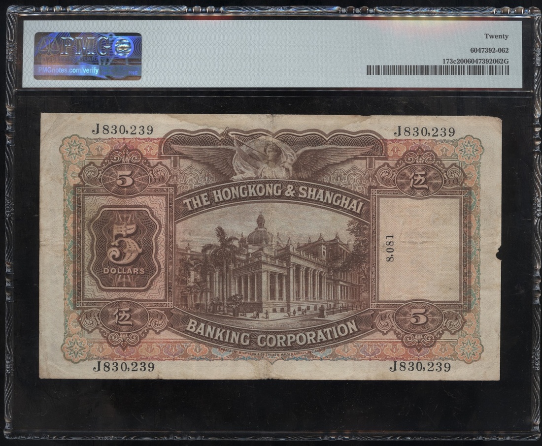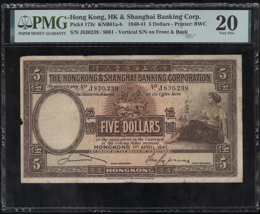 The Hongkong & Shanghai Banking Corporation, 5 Dollars, 1.4.1941, serial number J830239, with additional vertical serial number 8081, brown and multicoloured, (Pick 173c), PMG 20 Very Fine