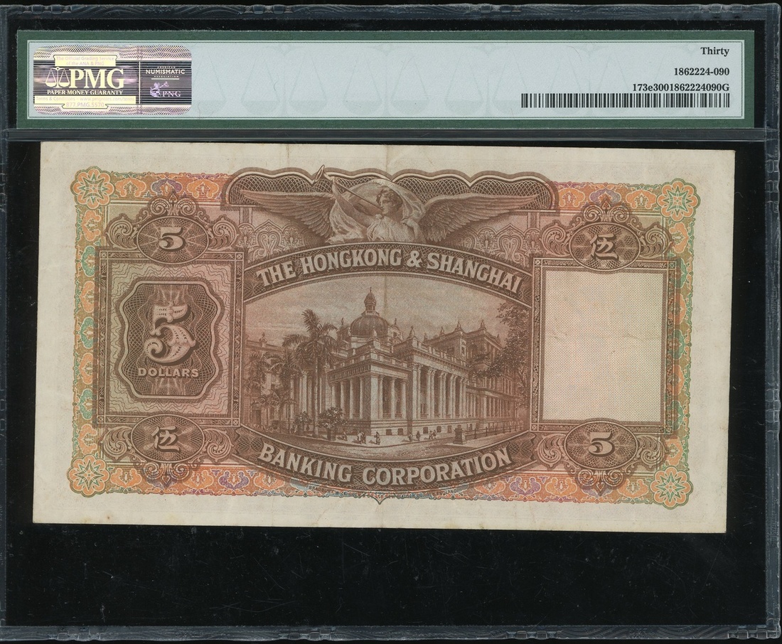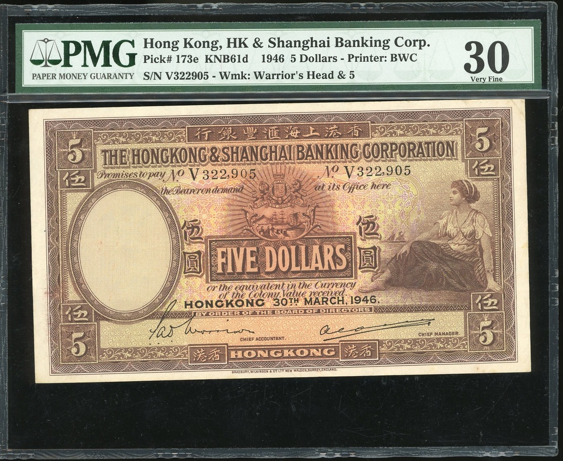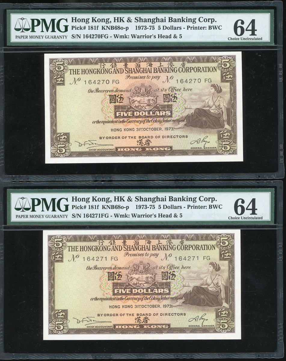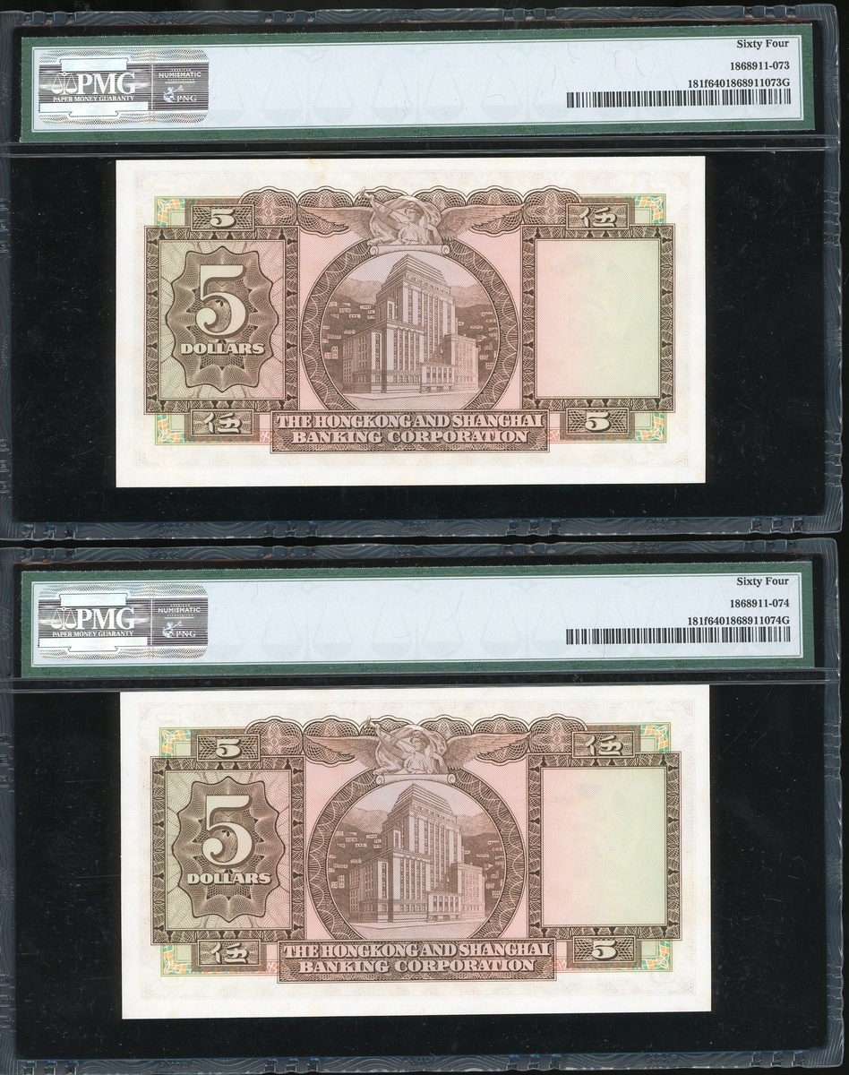 The Hongkong & Shanghai Banking Corporation, lot of 4 notes, 5 Dollars, 30.3.1946, serial numbers V322905 and V961219, 31.10.1973, serial numbers 164270FG-164271FG, brown and multicoloured, (Pick 173e, 181f), PMG 30 Very Fine -64 Choice Uncirculated (4)