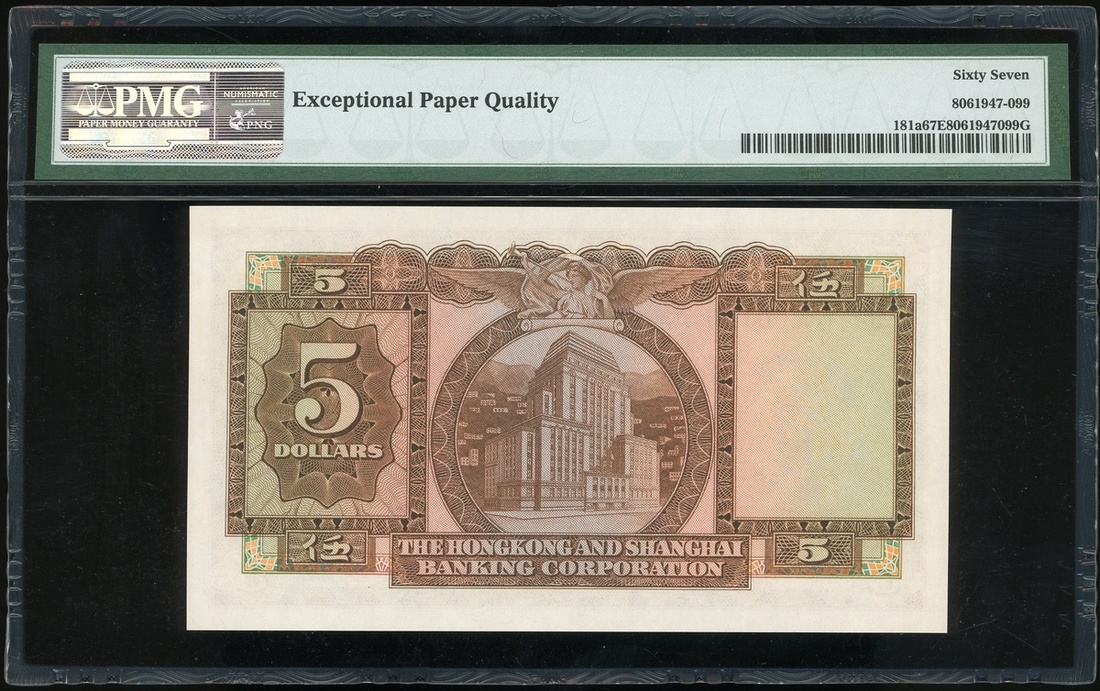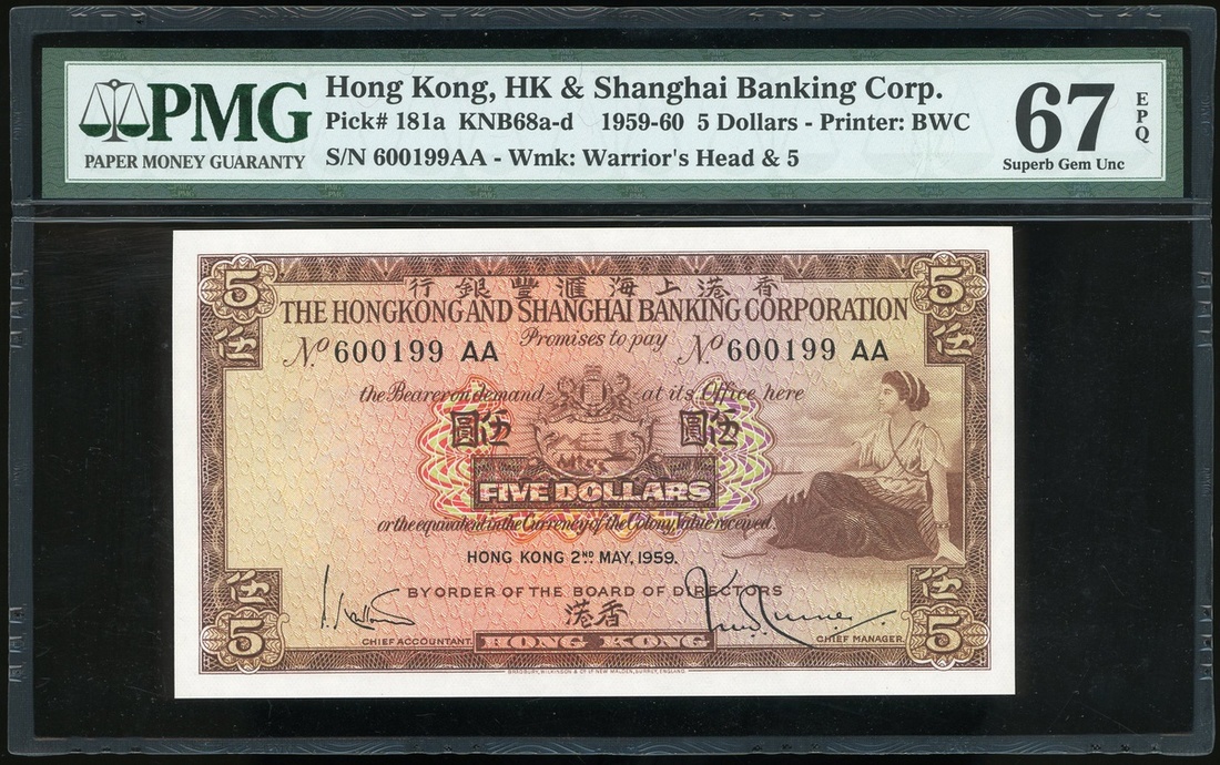 The Hongkong and Shanghai Banking Corporation, $5, 2.5.1959, serial number 600199AA, (Pick 181a), PMG 67EPQ Superb Gem Uncirculated. A nice first year and first prefix of issue