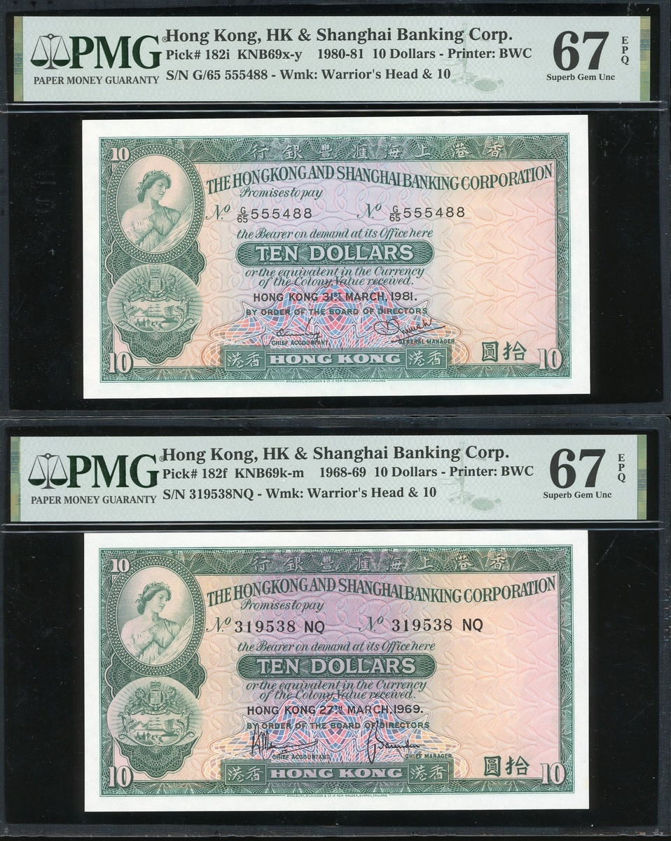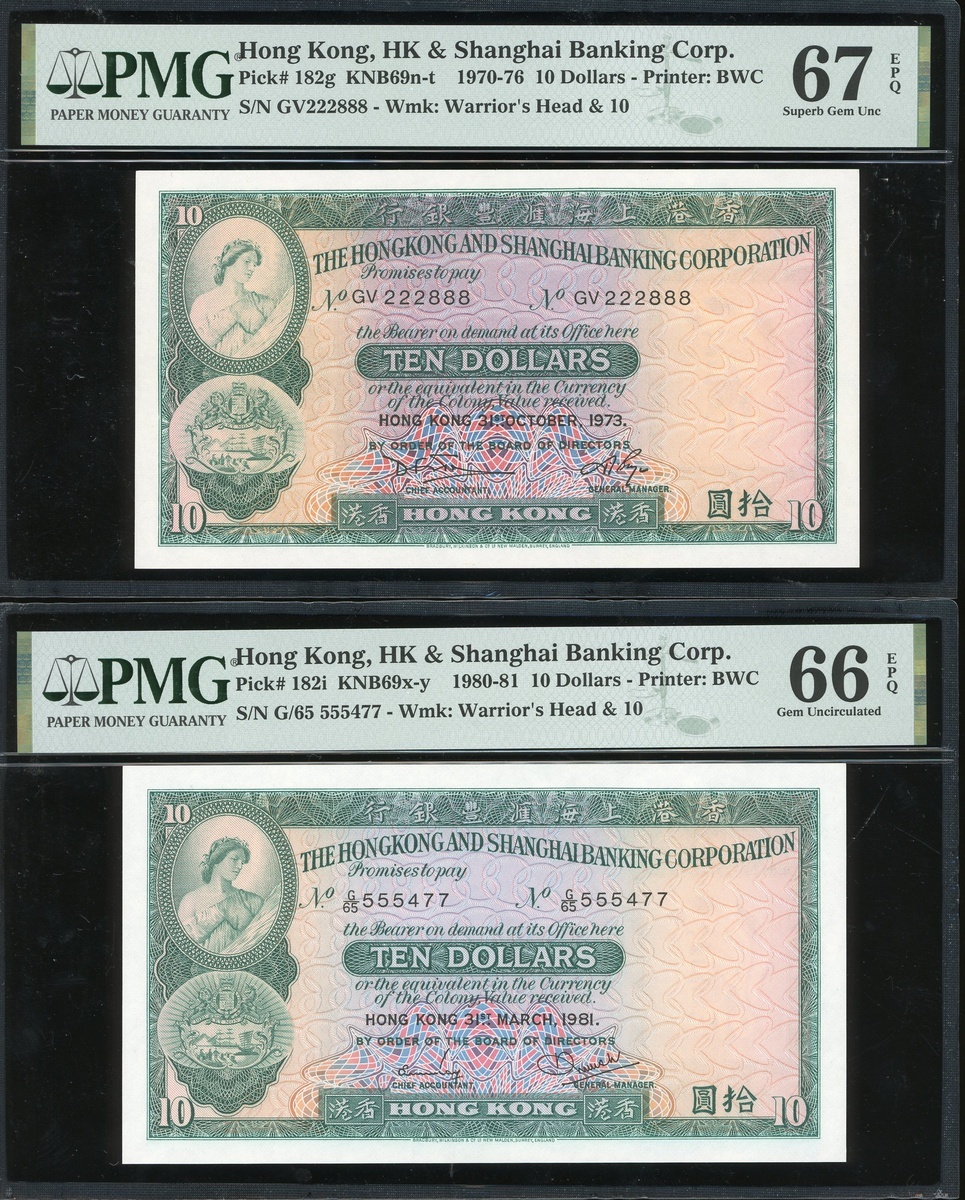 The Hongkong and Shanghai Banking Corporation, a group of 9 notes, consists of 4x $10, 1973, 1981(2) and 1969, and 5x $5, 1970, 1968, 1967, 1971 and 1965, some with fancy serial numbers GV222888, G/65 555477, G/65 555488, 319538 NQ, 718437 DD, 597335 CK, 07797 BS, 653766 DN and 555371 BH, (various Picks), graded PMG 58EPQ-67EPQ (9)