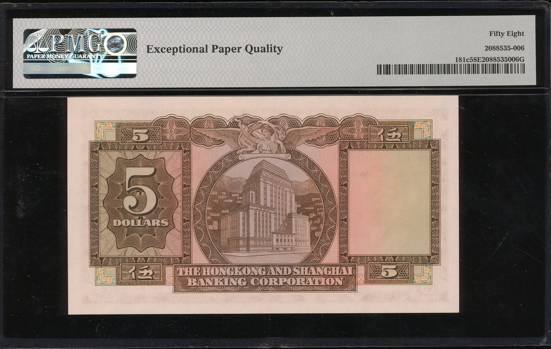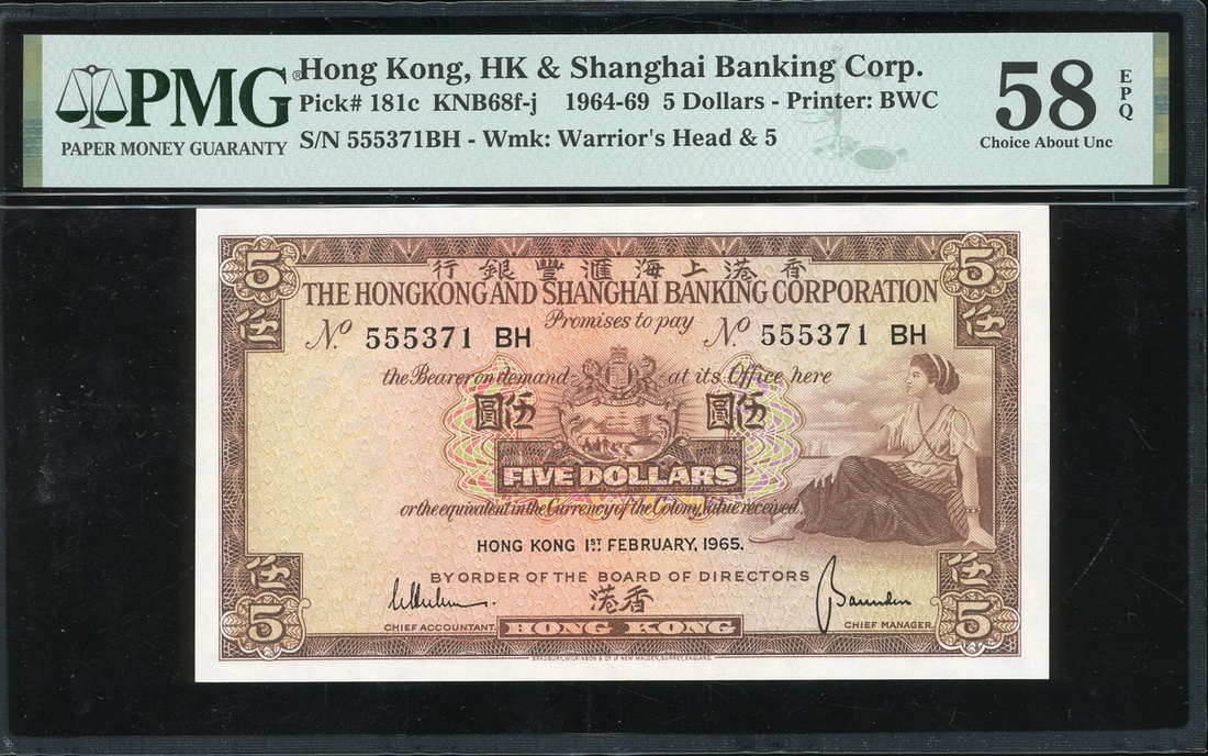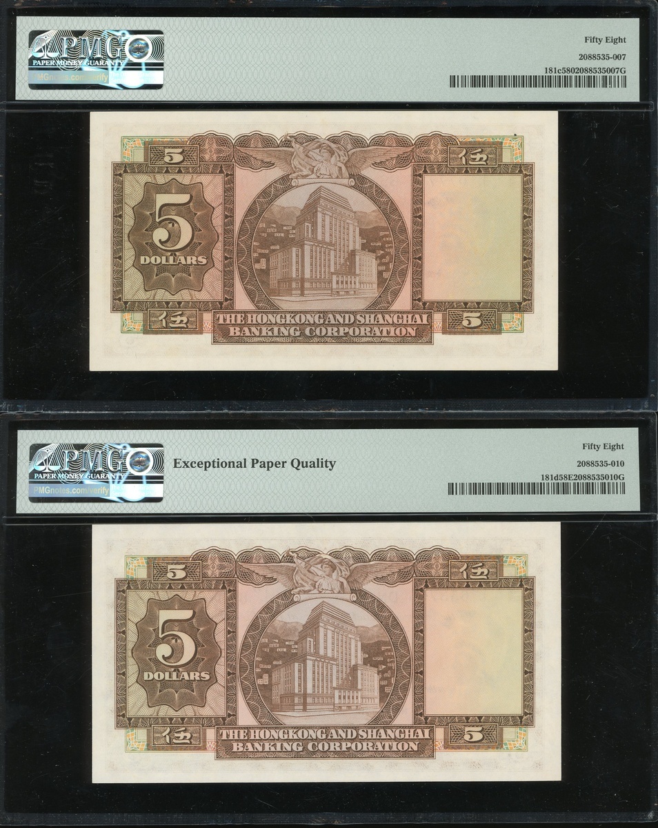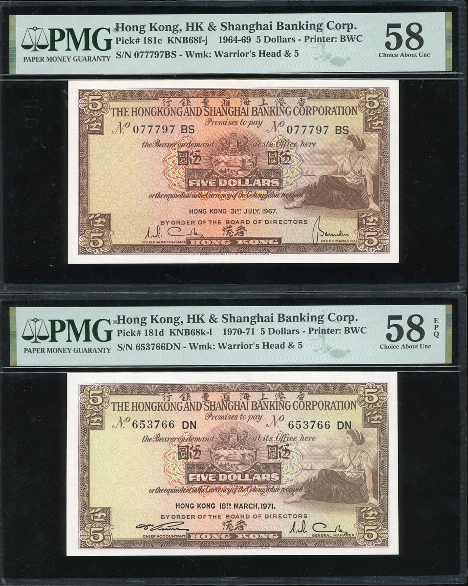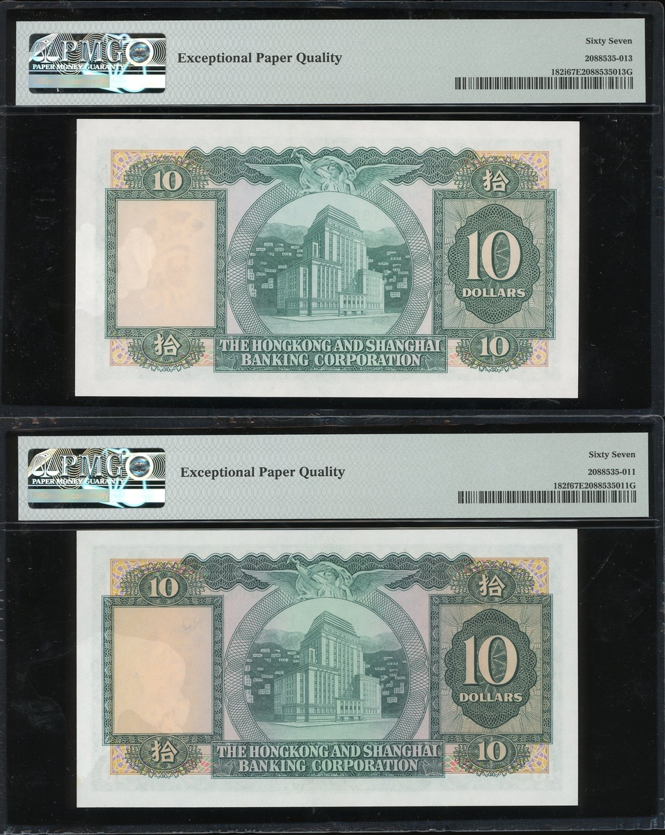 1965-81年香港上海匯豐銀行一組9枚5元及10元,其中10元的年份為1973,1981兩枚及1969;5元的年份為1970,1968,1967,1971及1965,有些編號屬於趣味號,包括GV222888,G/65 555477,G/65 555488,319538 NQ,718437 DD,597335 CK,07797 BS,653766 DN及555371 BH,評PMG 58EPQ至67EPQ
