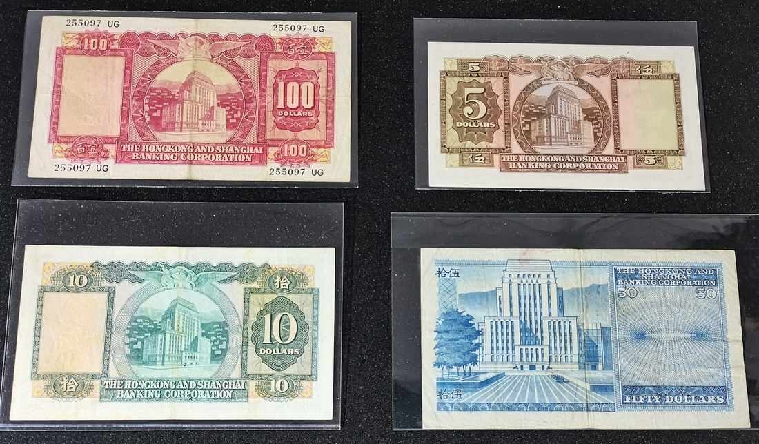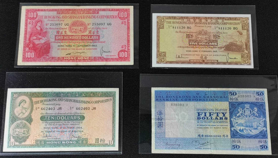 1962-80年香港上海匯豐銀行一組4枚5,10,50及100元,其中50元為重複號838383X,其他編號為811120 BG,662403JR及838383X,而5元屬於印刷移位錯體,UNC品相,其他約XF品相並有漬,10元及50元為重要年份